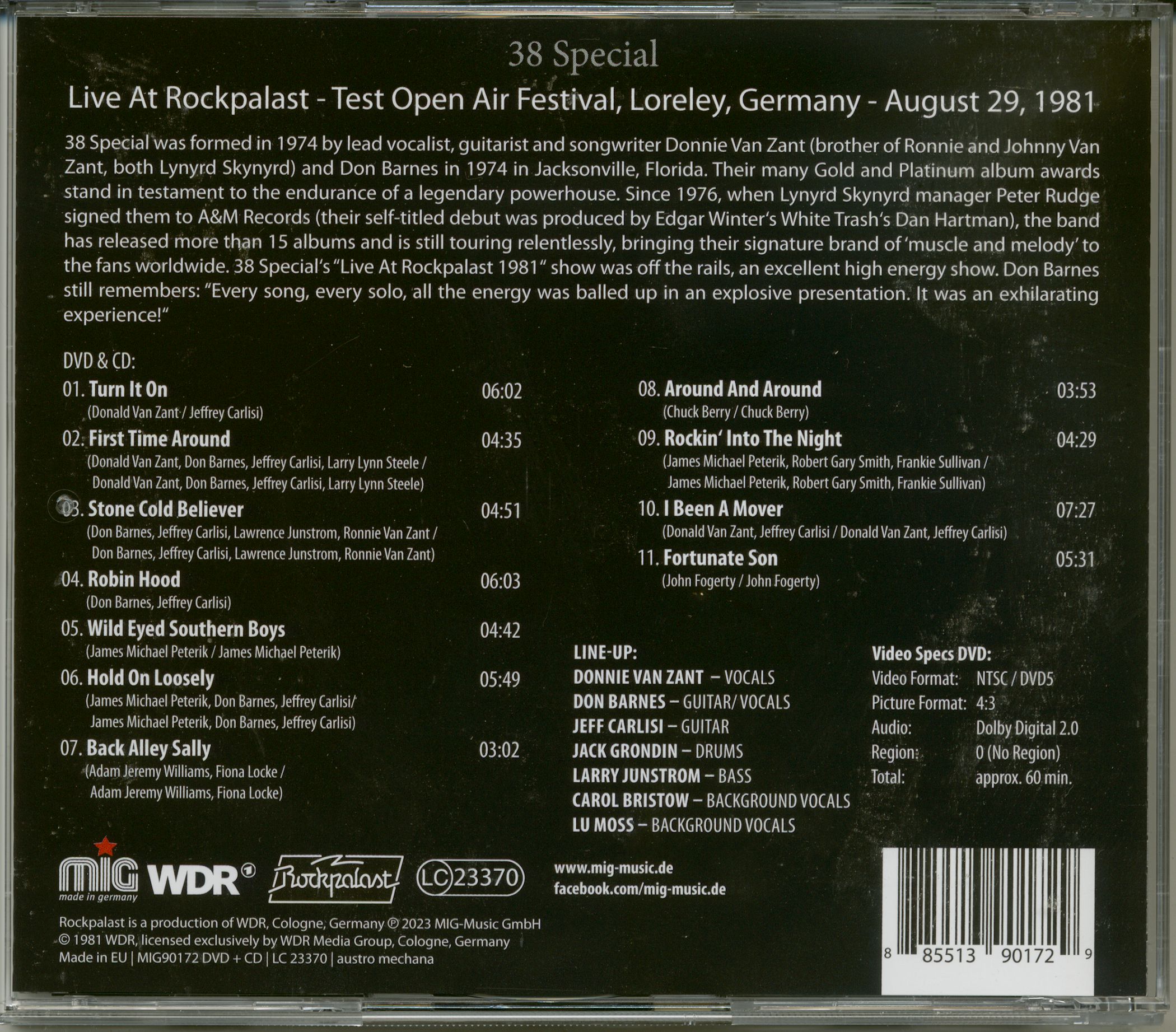 . C'était le premier des nombreux grands événements en plein air du WDR Rockpalast dans cette ambiance naturelle unique à St. Goarshausen. 38 Special a livré un excellent spectacle énergique, le groupe était au top de sa forme, le line-up de l'époque avec Donnie Van Zant, Don Barnes, Steve Brookins, Jeff Carlisi et Larry Junstrom au sommet de leur art. Les voix et le son étaient au rendez-vous. Quiconque regarde le DVD remarquera immédiatement que 38 Special s'est autant amusé que le public.