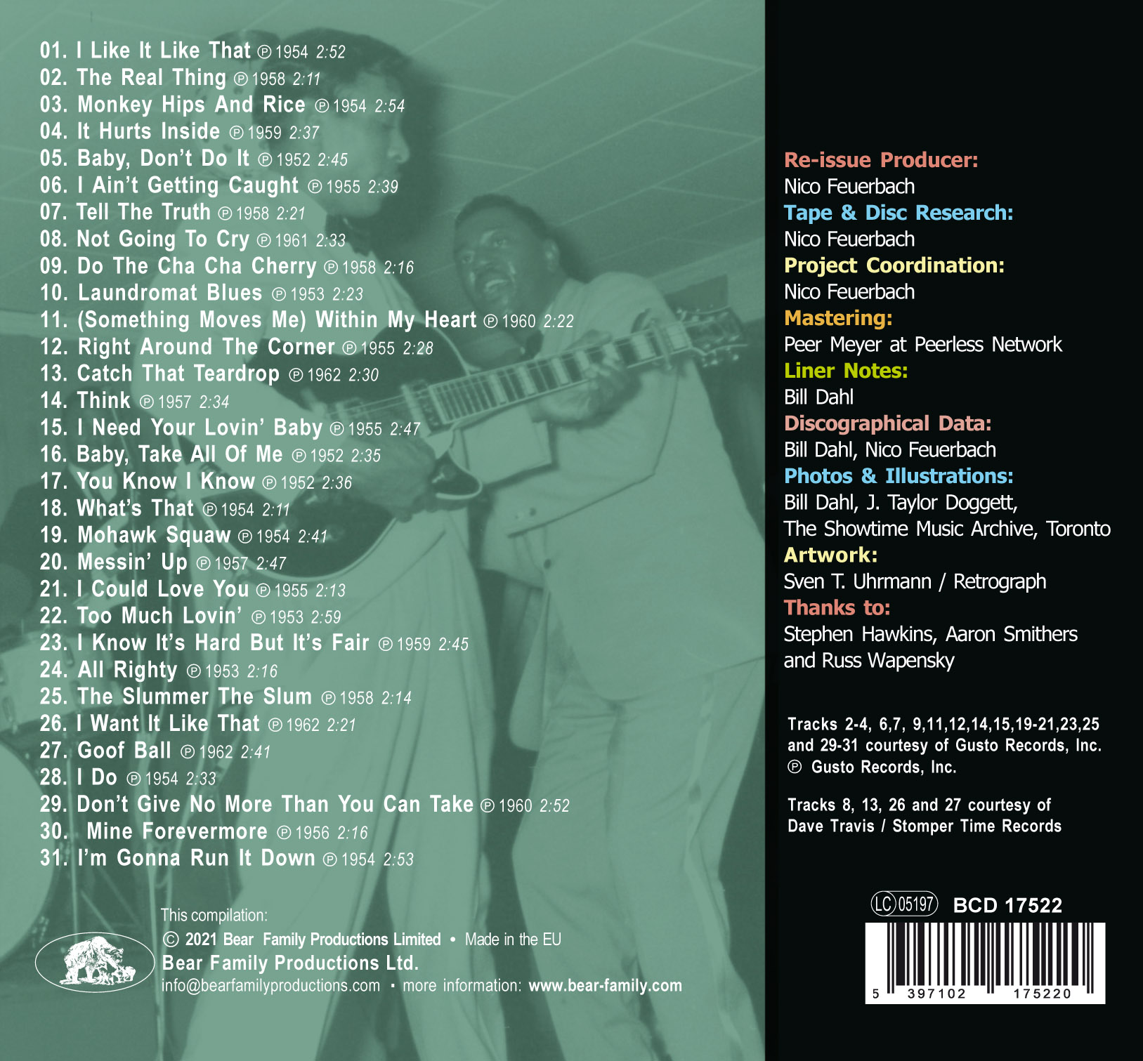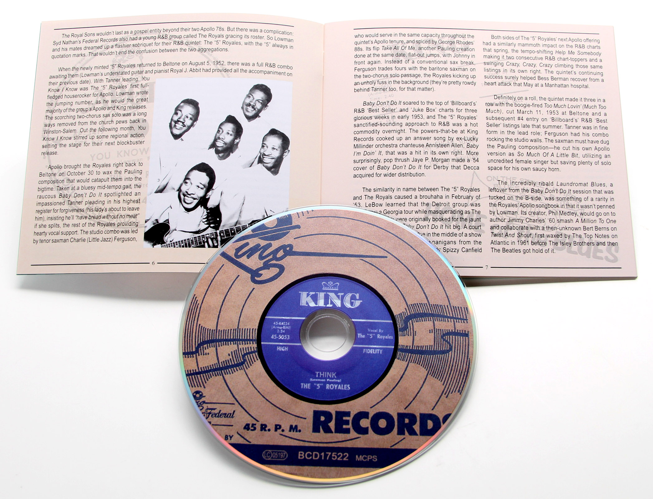 Featuring one of the acknowledged best doo-wop groups, Bear Family presents the rockiest tracks by the "5" Royales. Hailing from Winston-Sa- lem, North Carolina, the group started out singing gospel and later moved into rhythm'n'blues. On this album, which covers the years 1952 to 1962, we get tracks from Apollo, King and Home of the Blues. Guitarist Lowman Pauling was also a source of inspiration for Steve Cropper. Like Clyde McPhatter and Ray Charles, the "5" Royales played a crucial role in combining melismatic gospel singing with rhythm and blues lyrics and instruments to invent soul music. The powerhouse vocal quintet from Winston-Salem, North Carolina started out- ending with spiritual songs, but after signing to New York's Apollo Records in 1951, they went on a secular path and scored their biggest hits in the first half of the '50s on Billboard's rhythm'n'blues chart with songs like "Baby Don't Do It" (#1, 1953), "Help Me Somebody" (#1, 1953), "Crazy, Crazy, Crazy" (#5, 1953), "Too Much Lovin'" (#4, 1953), "I Do" (#6, 1954), "Tears Of Joy" (#9, 1957) and "Think" (#9, 1957). The 32-page booklet features several exquisite color images and the text is compiled by Bill Dahl. A well-fed album with many excellent tracks that I think will go down well with doo-wop fans.