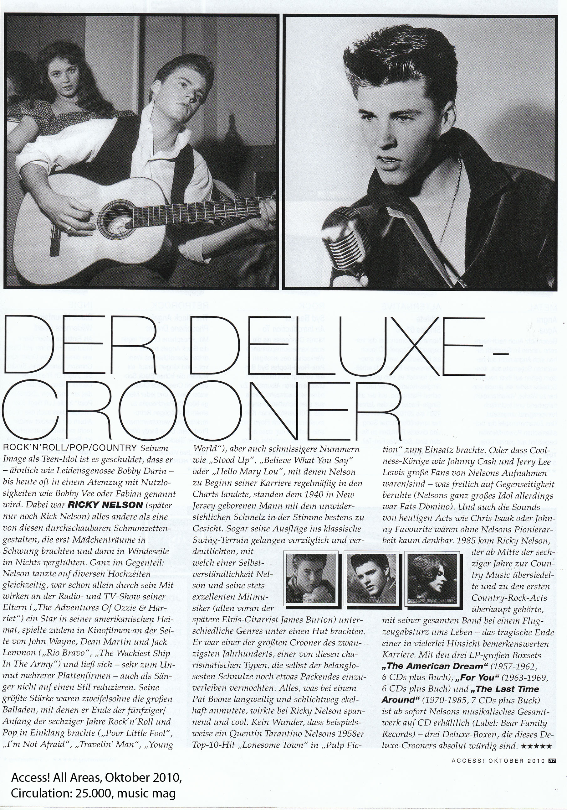 Au contraire : Nelson dansait à plusieurs mariages en même temps, était une star dans son pays natal américain juste par sa participation à l'émission de radio et de télévision de ses parents ("The Adventures Of Ozzie & Har-riet"), également joué dans des films aux côtés de John Wayne, Dean Martin et Jack Lemmon ("Rio Bravo", "The Wackiest Ship In The Army") et - au grand dam de plusieurs maisons de disques - ne pouvait être réduit à un seul style, même en tant que chanteur. Ses plus grandes forces sont sans doute les grandes ballades avec lesquelles il réconcilie rock'n'roll et pop à la fin des années 50 et au début des années 60 ("Poor Little Fool", "I'm Not Afraid", "Travelin' Man", "Young World"), mais aussi des chansons plus intelligentes comme "Stood Up", "Believe What You Say" ou "Hello Mary Lou", avec lequel Nelson se retrouve régulièrement dans les charts au début de sa carrière, étaient pour l'homme né dans le New Jersey en 1940 avec l'irrésistible mélodie de sa voix.