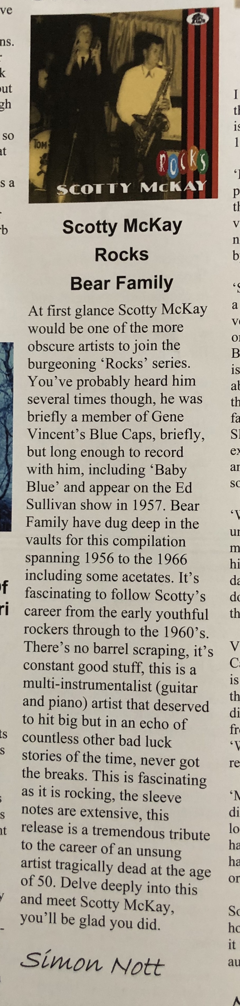 Bear Family ( At first glance Scotty McKay a would be one of the more obscure artists to join the burgeoning 'Rocks' series. is You've probably heard him at several times though, he was th briefly a member of Gene fa Vincent's Blue Caps, briefly, SI but long enough to record ea with him, including 'Baby ar Blue' and appear on the Ed sc Sullivan show in 1957. Bear 4,\ Family have dug deep in the vaults for this compilation spanning 1956 to the 1966 hi including some acetates.