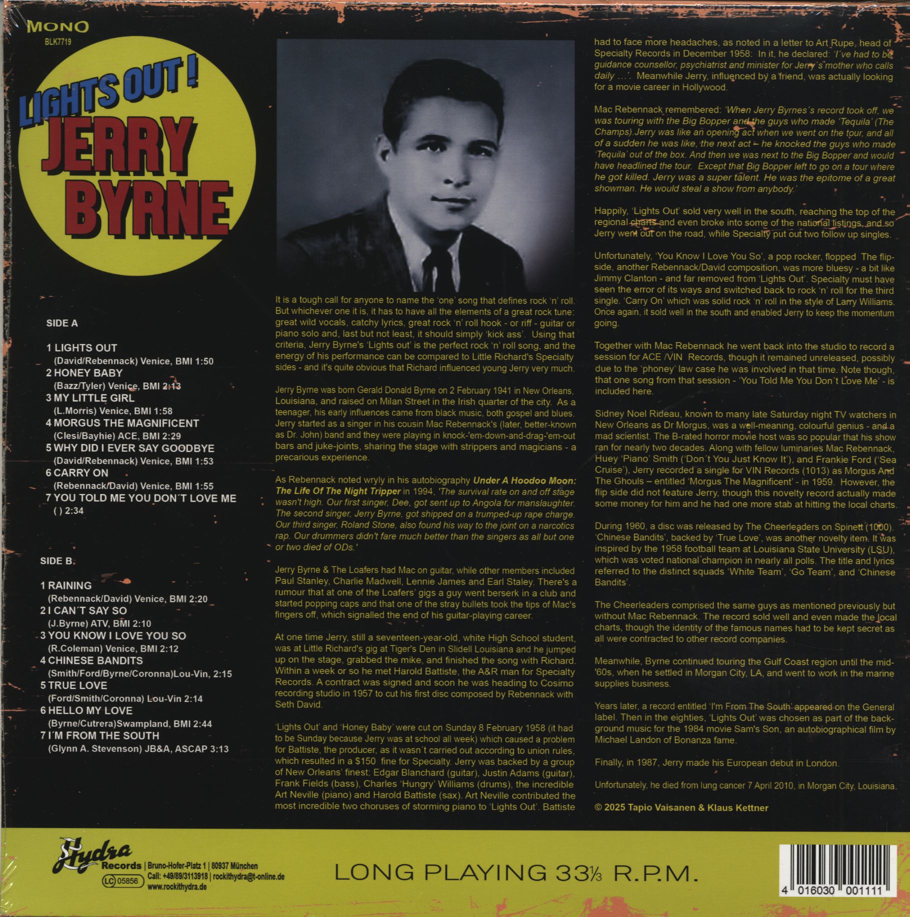 La chanson de Jerry Byrne, Lights Out, est la chanson de rock and roll sauvage par excellence des années 1950. Le fait que Mac Rebennack, plus connu sous le nom de Dr. John, ait participé à l'enregistrement ou en tant que compositeur à cette chanson et à d'autres n'a certainement pas nui à son succès. Little Richard l'a aidé à entrer dans sa maison de disques et le résultat a été les plus belles chansons de rock & roll de la Nouvelle-Orléans. « Lights Out » a fait un carton dans les hit-parades et a été suivi d'une longue tournée. D'autres disques solo et enregistrements en duo sous différents...