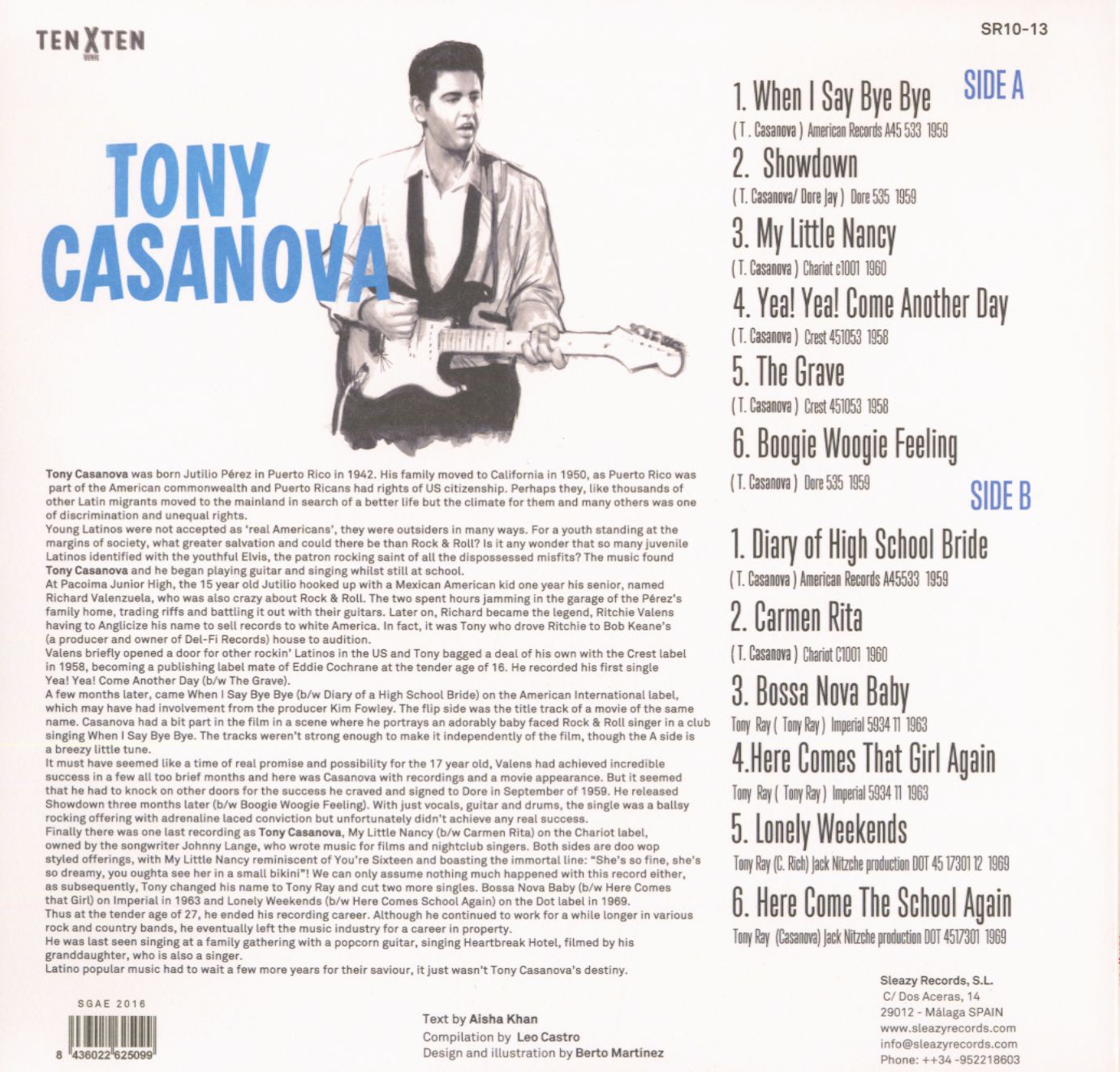 L'enregistrement complet du rockeur latino Tony Casanova, né en 1942 à Porto Rico. Sa famille a déménagé aux États-Unis en 1950 à Pacoima, Los Angeles, où Casanova a fréquenté le collège de Pacoima avec Ritchie Valens ! Tony Casanova et Ritchie Valens sont devenus amis et se sont rencontrés dans le garage de la maison familiale de Tony. C'est Tony Casanova qui a finalement présenté Ritchie Valens à Bob Keane, le propriétaire du label Del-Fi. Casanova lui-même a sorti son premier album sur le label Crest avec "Yea ! Yea ! Come Another Day" ! Tony Casanova a enregistré cinq autres disques 45 tours pour le label américain, Dore, Chariot, Imperial et Dot ! Casanova n'a jamais atteint le succès de Ritchie Valens mais ses 45 tours sont très recherchés de nos jours et de véritables pièces de collection ! Tous les enregistrements ont été faits entre 1958 et 1969 ! (Bear Family Records - nf)