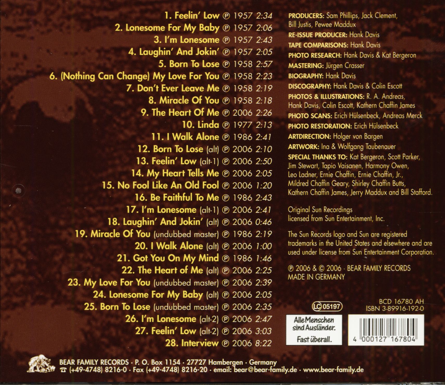 L'un des artistes les plus originaux et insolites Sun, Chaffin était sans vergogne pays à la hauteur de l'ère du rock & roll. Produit par le grand Pee Wee Maddux, Chaffin fait certains des plus grands registres nationaux de l'époque, y compris 'Feelin' Low ',' Je suis Lonesome »et bien d'autres. En prime, il ya une interview avec Chaffin, décédé dans un accident de ferme.