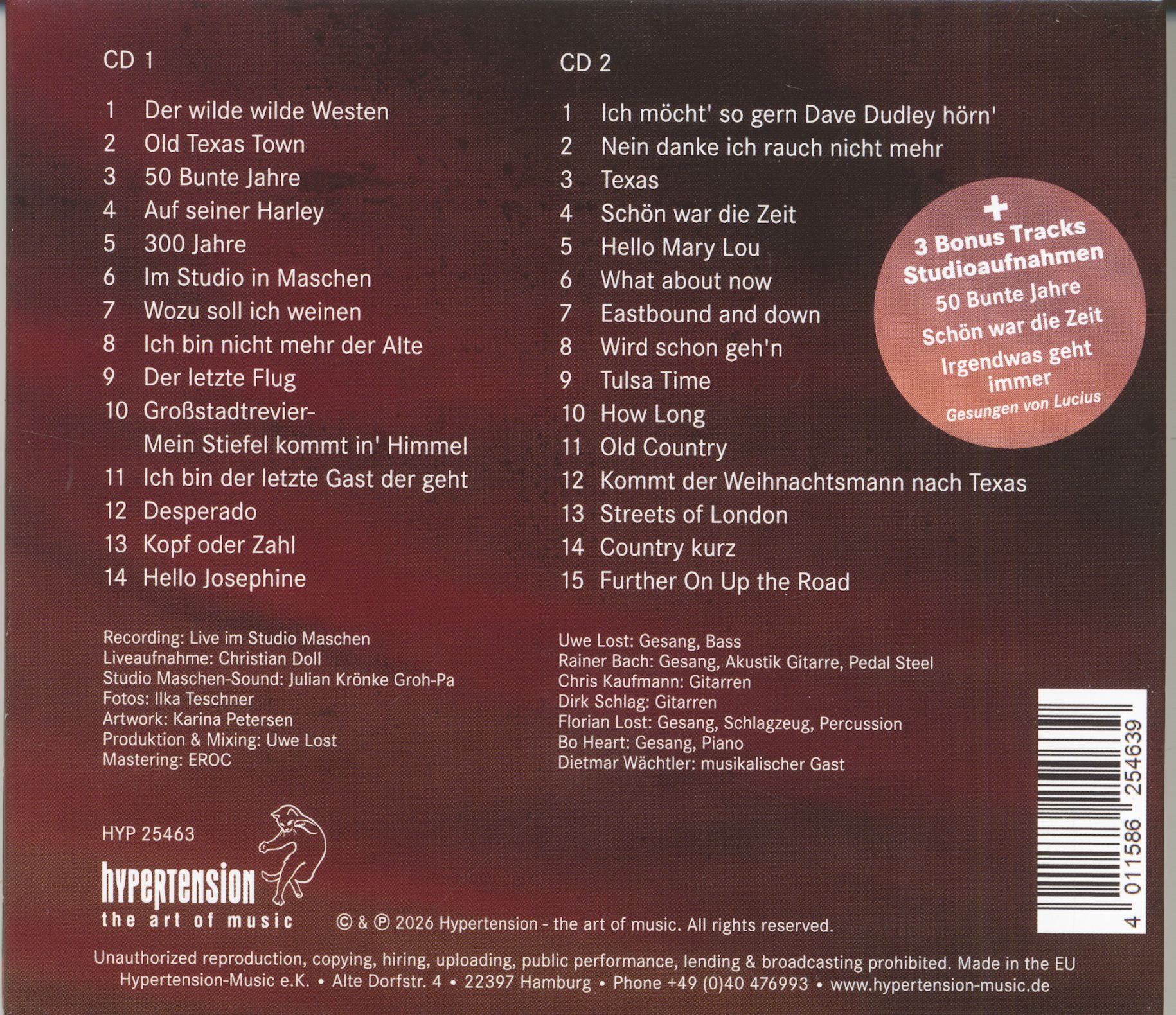 Aujourd’hui, plus de cinq décennies plus tard, ce sont précisément ces musiciens, figures emblématiques de cette époque qui ont contribué à façonner ce son, qui enfilent à nouveau leurs bottes pour se retrouver sur scène. Sous le nom de DIE COWBOYS, ils sont désormais de retour sur scène. Ils sont rejoints par Rainer Bach et Uwe Lost, Dirk Schlag, Chris Kaufmann et Florian Lost, tous chanteurs et musiciens qui ont contribué à faire connaître la musique country en Allemagne.