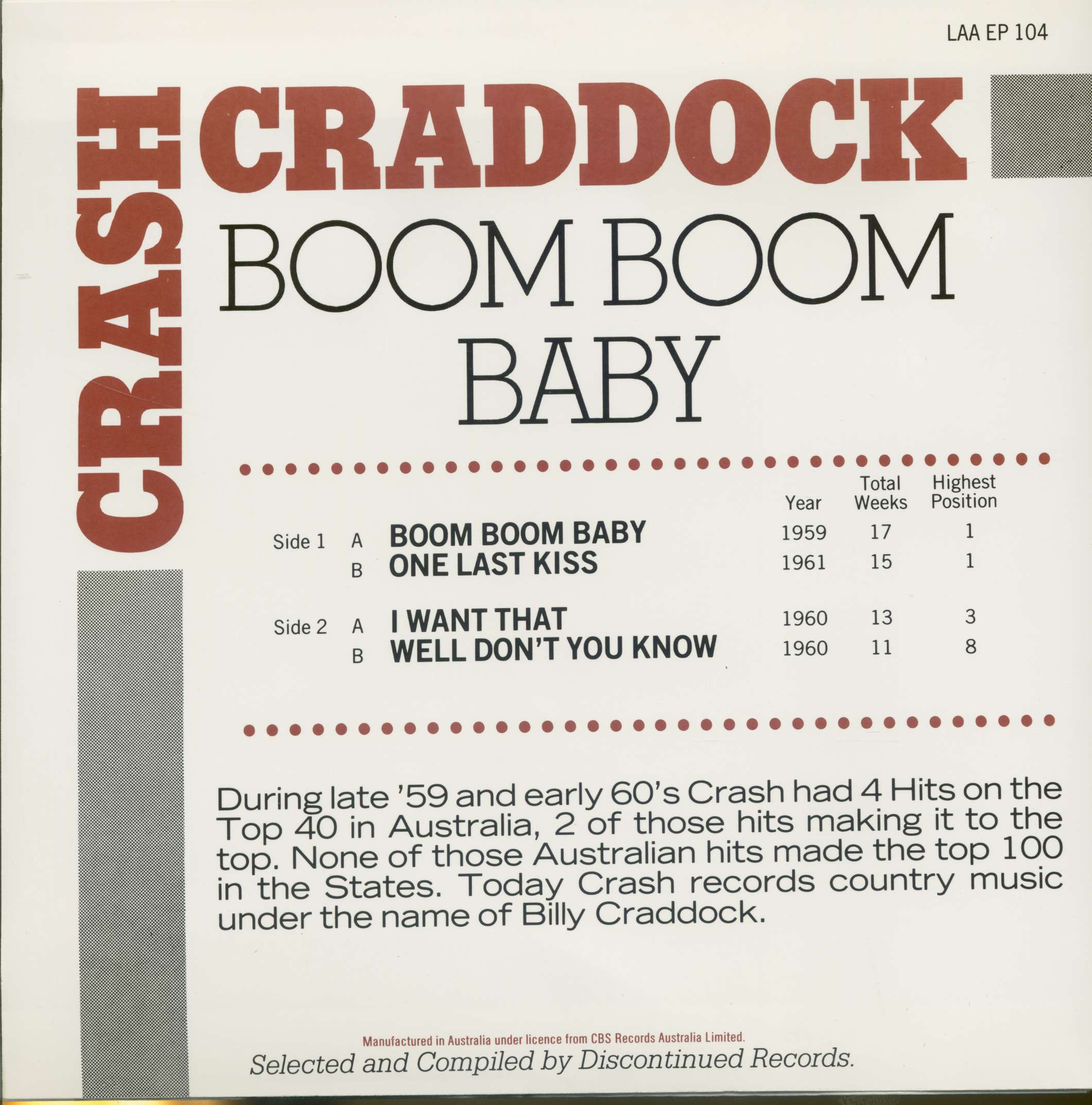 During late '59 and early 60's Crash had 4 Hits on the Top 40 in Australia, 2 of those hits making it to the top. None of those Australian hits made the top 100 in the States. Today Crash records country music under the name of Billy Craddock.