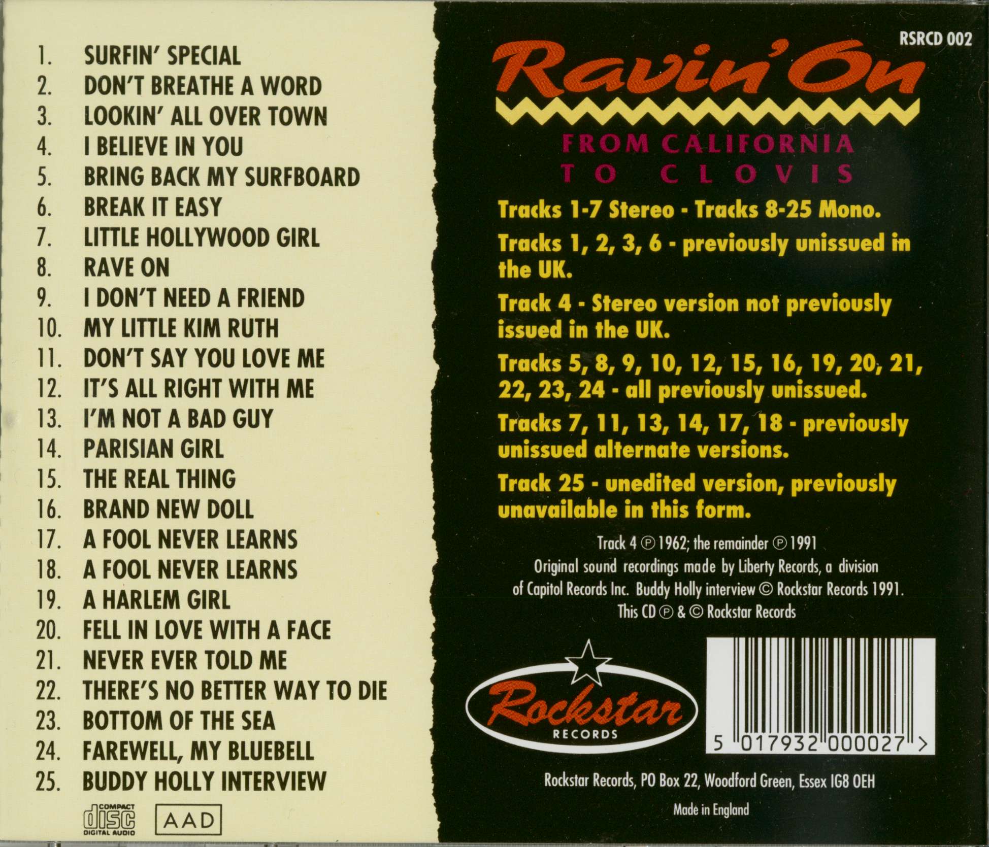 Cette édition spectaculaire présente 19 performances inédites, dont plusieurs versions alternatives et une interview rare de Buddy Holly. Le livret comprend une photo inédite de Buddy Holly prise au moment de l'interview. Masterisé par Boppin' Bob Jones !