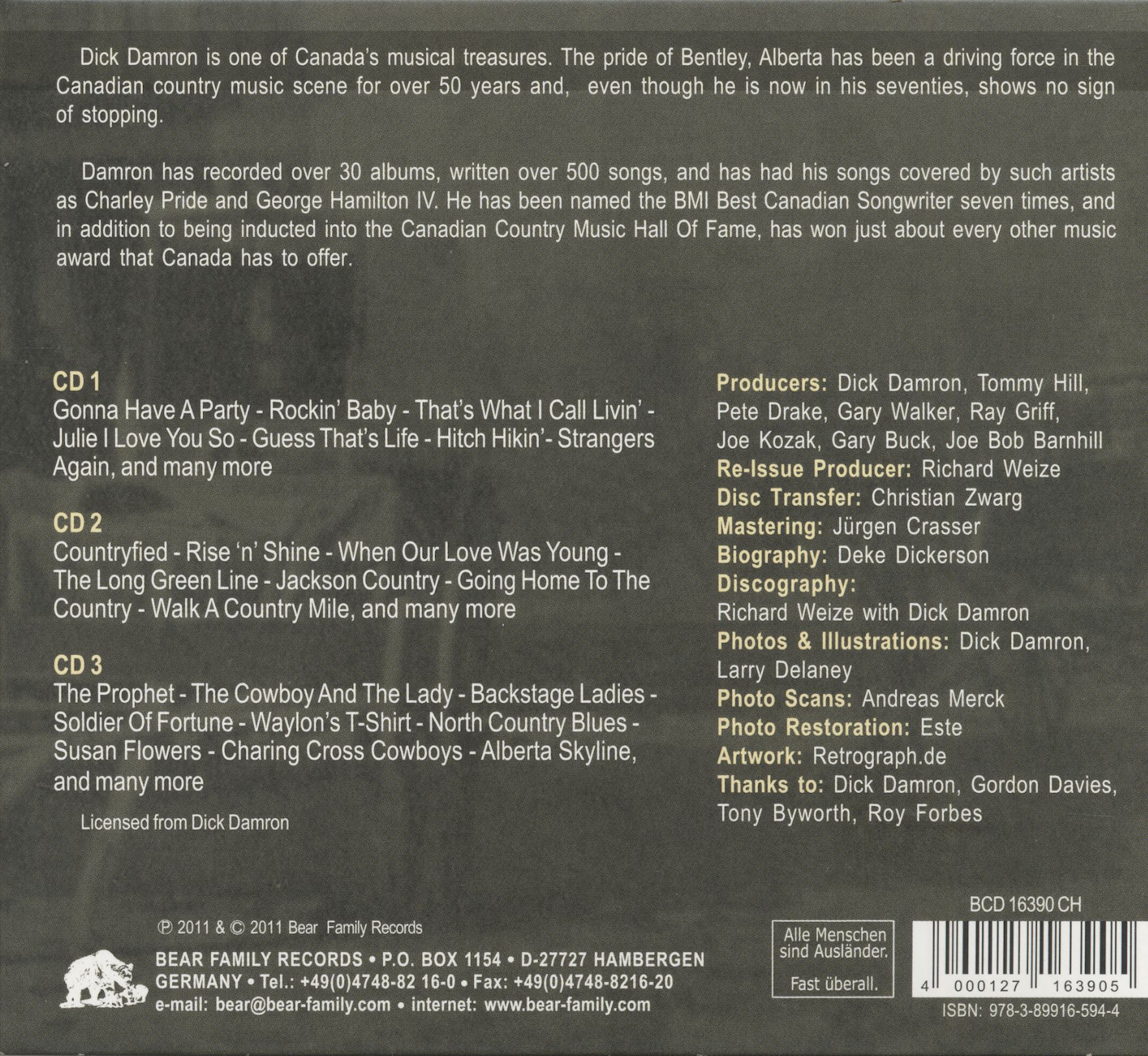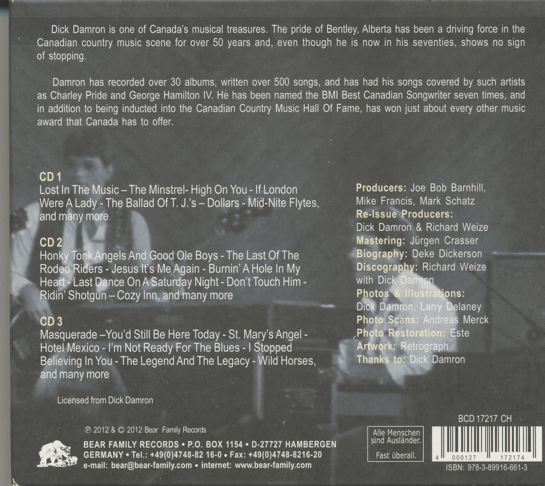 Ce coffret de 6 CD constitue la rétrospective définitive de Dick Damron, figure majeure de la country canadienne, souvent surnommé le « Willie Nelson du Canada ». Membre du Canadian Country Music Hall of Fame, Damron a marqué plus de six décennies de musique avec un style mêlant rockabilly, honky tonk, country traditionnel et ballades sensibles.