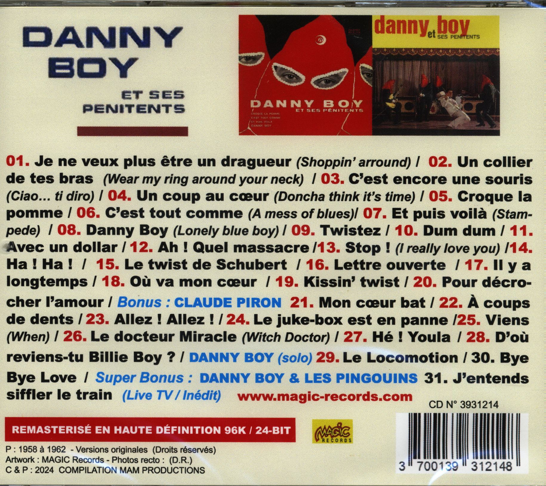 Voici pour la première fois en CD tous les titres de DANNY BOY (alias CLAUDE PIRON) ET SES PENITENTS (20 titres) + les deux premiers 45 tours EPs de CLAUDE PIRON (8 titres) ainsi que 2 titres solo de DANNY BOY sans ses Pénitents et un live inédit de DANNY BOY accompagné des PINGOUINS, le tout remasterisé en haute définition avec toutes les pochettes originales de l'époque reproduites dans le livret. Un vrai régal de rock n' roll.