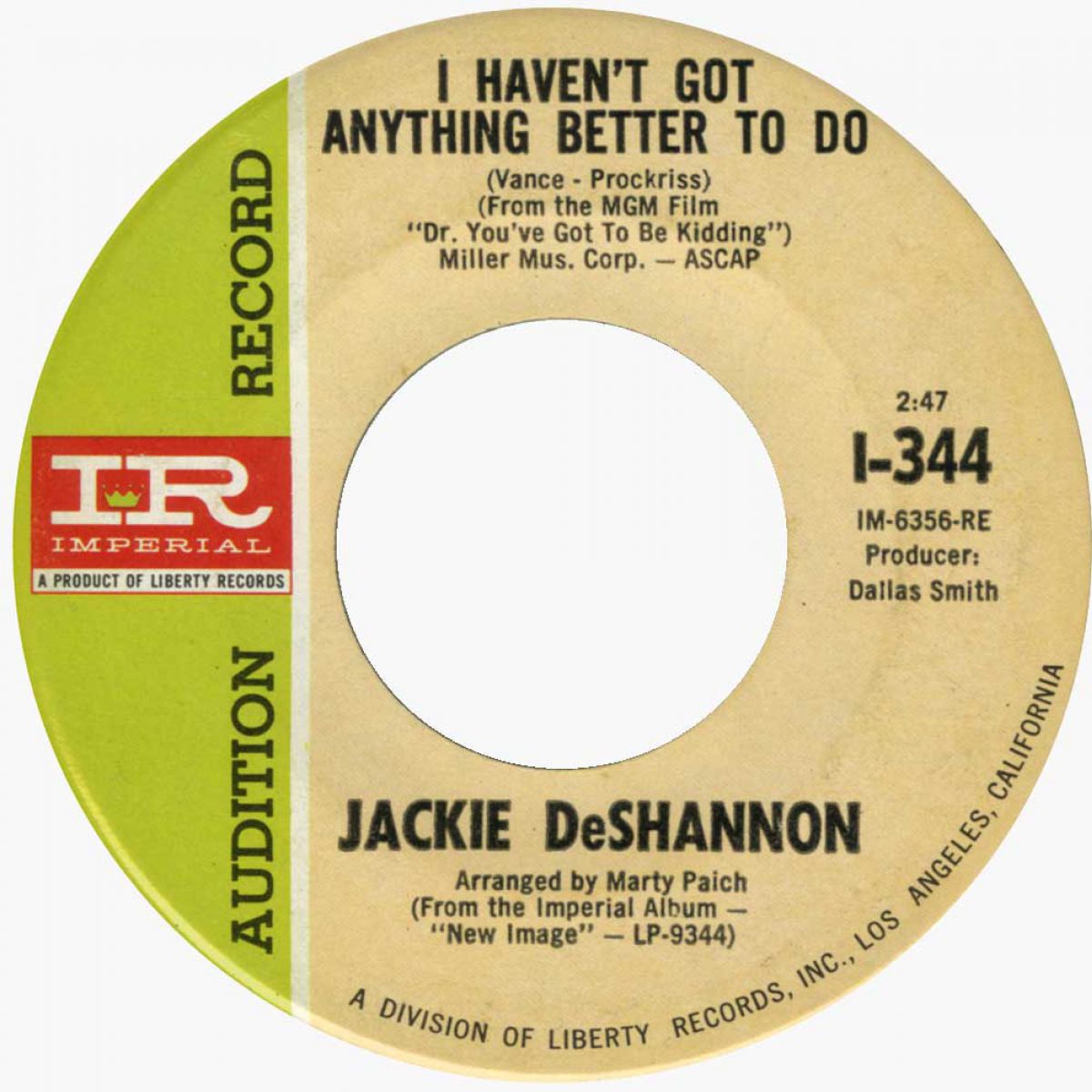 Jackie, or Sharon Myers to give her true name, was born in Hazel, Kentucky on August 21, 1944, and moved with her parents to the Chicago area when she was eleven. She recorded for Mar-Vel (as Sherry Lee), Gone and Liberty (as Jackie Dee), Fraternity (as the Cajuns with Jacquie Shannon), and on PJ, Sage, and Dot (as Jackie Shannon), and Edison International (as Jackie DeShannon). Her tour of the minor labels complete, she returned to Liberty in 1960.