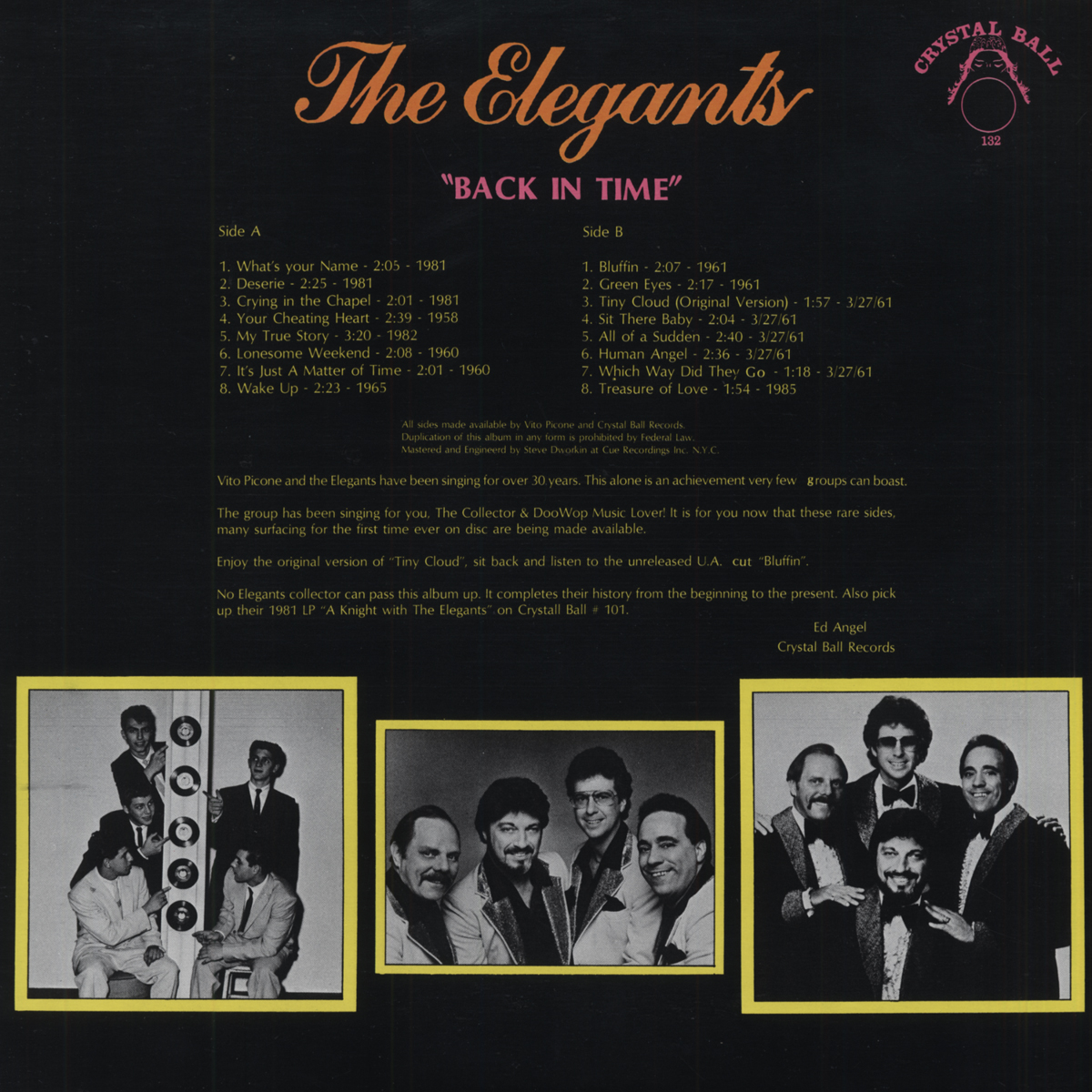 Just as New York was ground zero for black vocal groups, now a battalion of Italian-American aggregations from the same metropolis followed their lead. The Elegants hailed from Staten Island; lead singer Vito Picone and baritone Carman Romano had been members of Pat Cordel and The Crescents, whose 1956 kiddie sound single Darling Come Back, which Vito wrote, came out on the Club label.