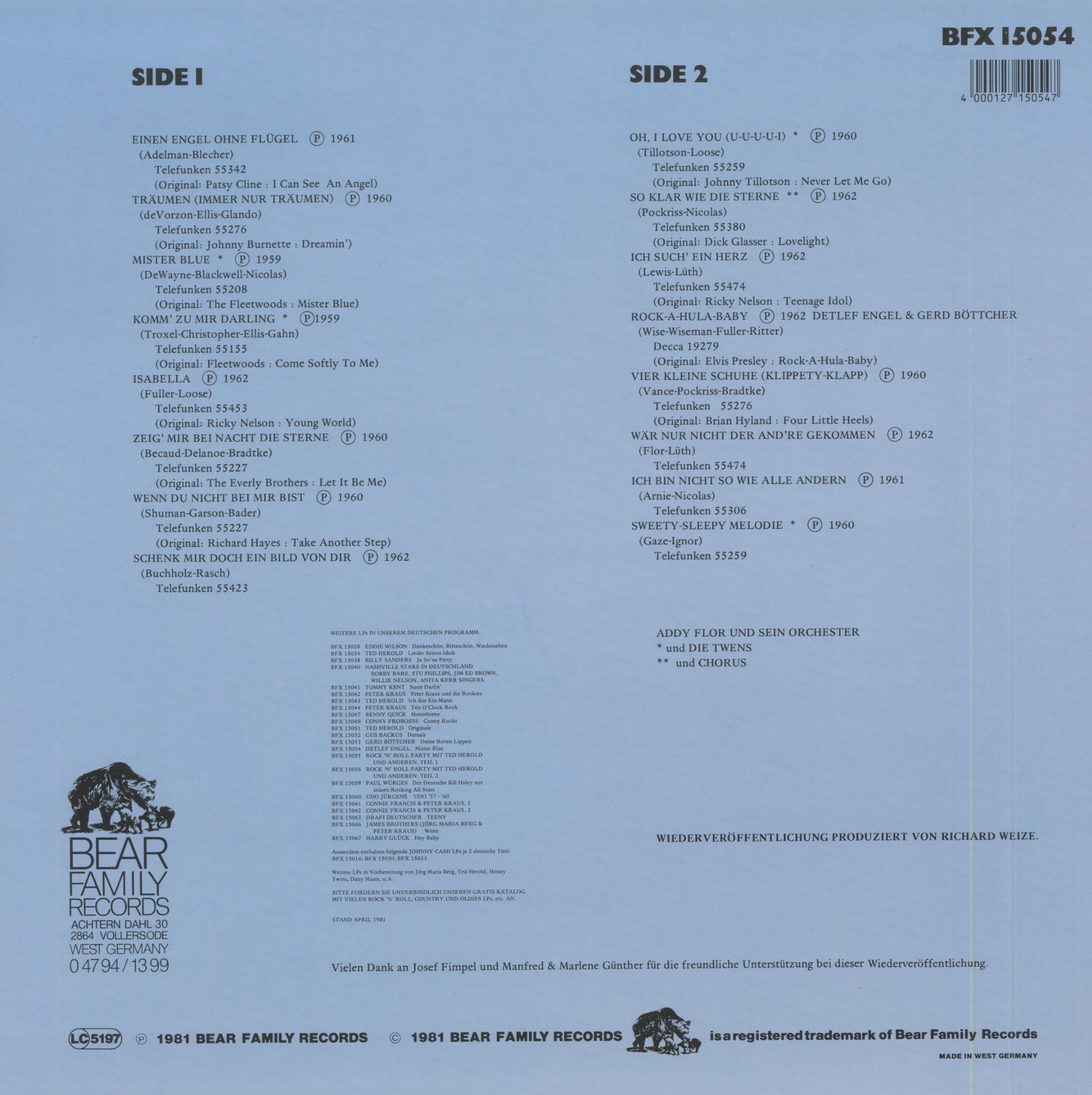 Detlef Engel était l'Allemand Ricky Nelson. Né le 13 janvier à Berlin sous le nom de Detlef Hensel, le chanteur est resté largement fidèle au style rock'n' roll du lycée. Il n'est donc pas surprenant qu'il ait couvert deux chansons doo-wop des Fleetwoods blancs d'Olympia, Washington. Tout comme Rick Nelson, Engel est né avec la musique.