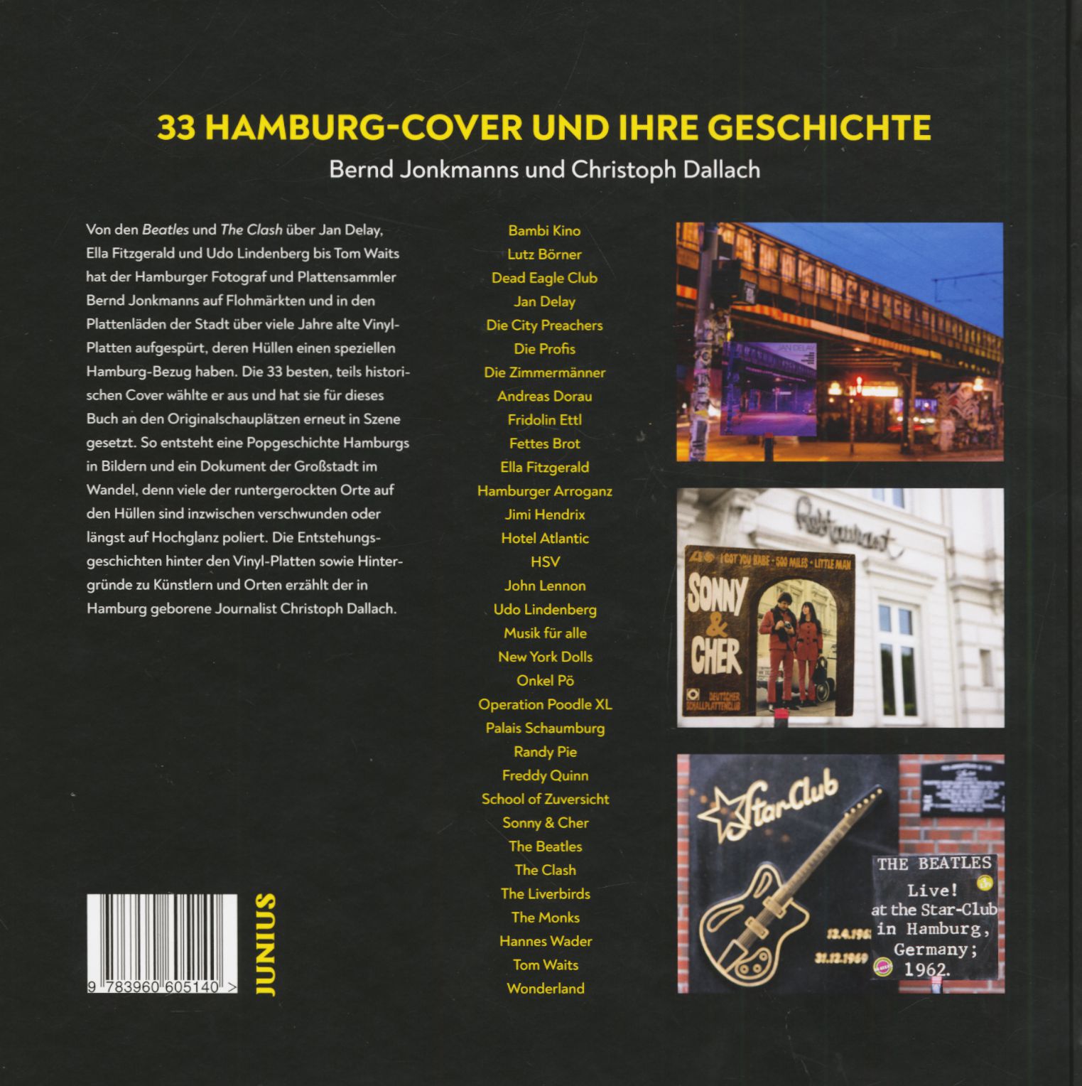 Des Beatles et du Clash ? Jan Delay, Ella Fitzgerald, Udo Lindenberg et Tom Waits, le photographe et collectionneur de disques hambourgeois Bernd Jonkmanns a retrouvé dans les marchés aux puces et les magasins de disques de la ville des disques vinyles vieux de plusieurs années dont les pochettes ont une référence particulière ? Hambourg. Il a sélectionné les 33 meilleures couvertures, en partie historiques, et les a mises en scène ? nouveau pour ce livre dans les lieux d'origine. Le résultat est une histoire pop de Hambourg en images et un document de la ville en mouvement, car de nombreux endroits en pierre sur les couvertures ont entre-temps disparu ou ont été polis depuis longtemps pour devenir très brillants. Le journaliste hambourgeois Christoph Dallach raconte les histoires qui se cachent derrière les disques vinyles et le parcours des artistes et des lieux.
