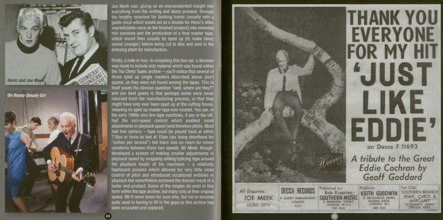 Avec des annotations de feu Rob Bradford (rédacteur en chef du magazine Thunderbolt de la Joe Meek Society) et du conservateur Richard Anderson, ainsi que des séquences inédites et des photos de boîtes de bandes, ce somptueux coffret est un must, non seulement pour les fans de Heinz et de Joe Meek, mais aussi pour tous ceux qui s'intéressent à l'histoire de la musique pop britannique et à l'art des studios de production.