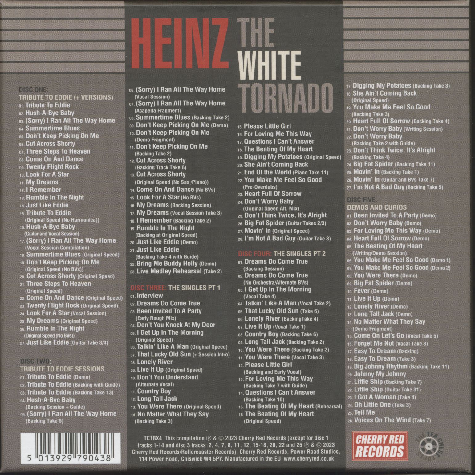 Ce coffret 5CD contient une extraordinaire richesse de titres d'albums et de singles, d'enregistrements de sessions, de pistes instrumentales et d'accompagnement, de versions alternatives et de démos, et même une interview et un enregistrement de répétition en direct, tous tirés des archives légendaires du groupe et soigneusement restaurés et compilés pour votre plaisir d'écoute. Le matériel rassemblé sur "The White Tornado" peut être écouté avec une clarté remarquable et à la vitesse originale (bien que les versions publiées aient souvent été accélérées), jetant un nouvel éclairage sur Heinz lui-même ainsi que sur le génie de l'écriture et de la production qui a marqué sa carrière. Il n'est pas exagéré de dire que Meek avait plusieurs années d'avance sur de nombreux grands studios commerciaux en termes de production et de qualité d'enregistrement.