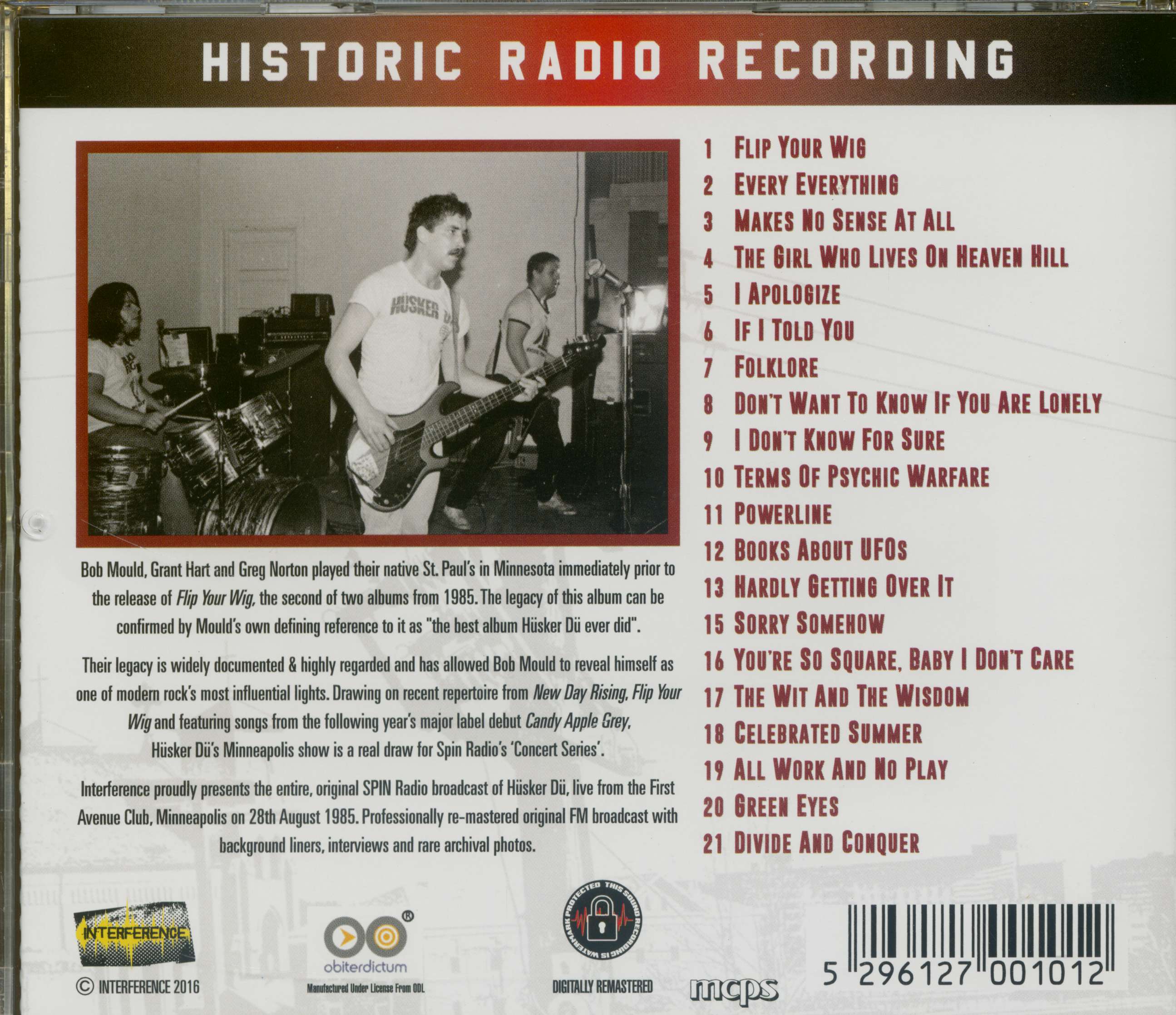 S'inspirant du répertoire récent de New Day Rising, Flip Your Wig et mettant en vedette des chansons du premier grand label de l'année suivante, Candy Apple Grey, le spectacle de Hiisker Dii à Minneapolis est une véritable attraction pour la série de concerts de Spin Radio. Interference est fier de présenter l'intégralité de l'émission radiophonique originale de Husker Dii, diffusée en direct du First Avenue Club, Minneapolis, le 28 août 1985. Diffusion FM originale remasterisée par des professionnels avec des doublures de fond, des interviews et de rares photos d'archives