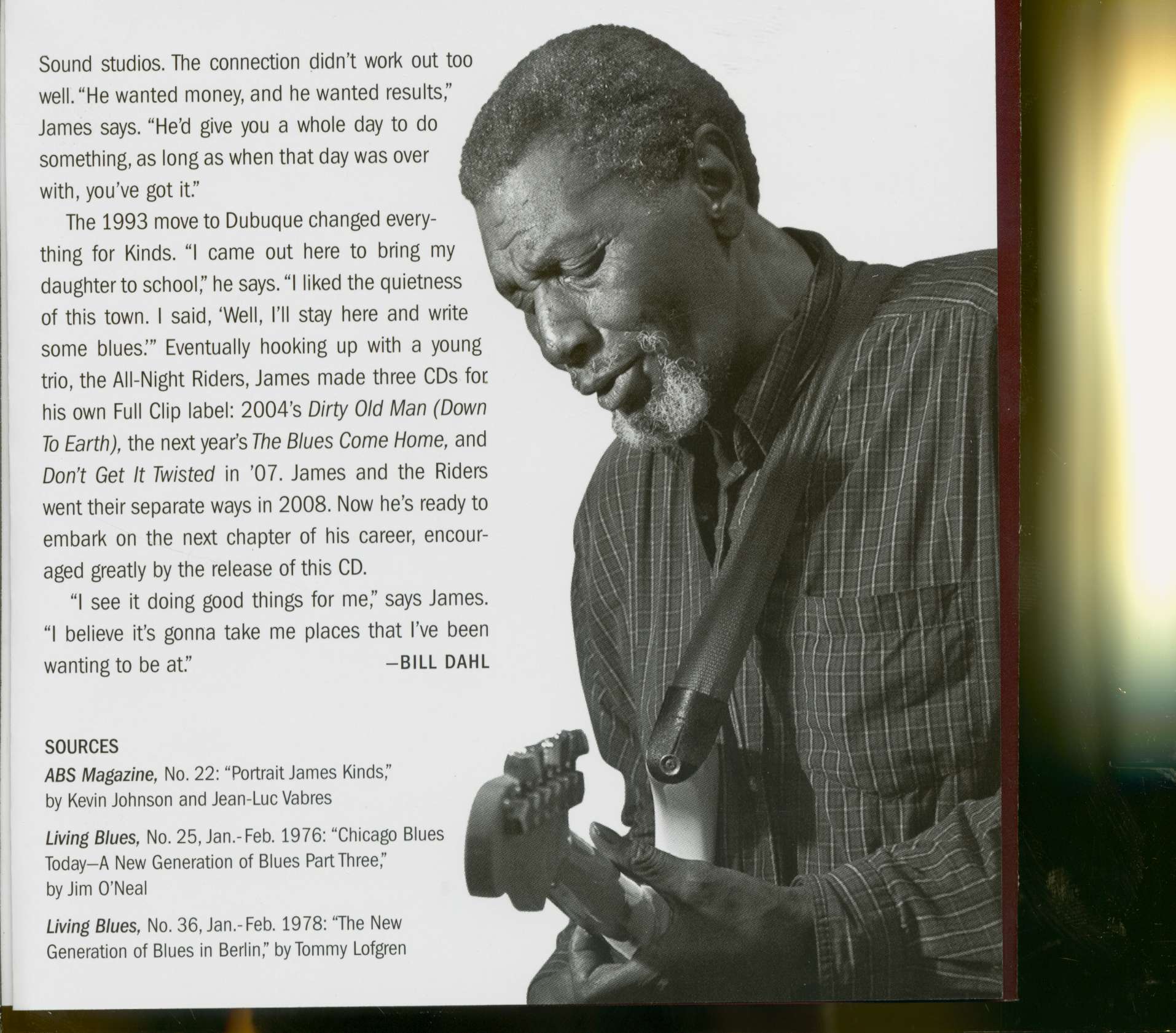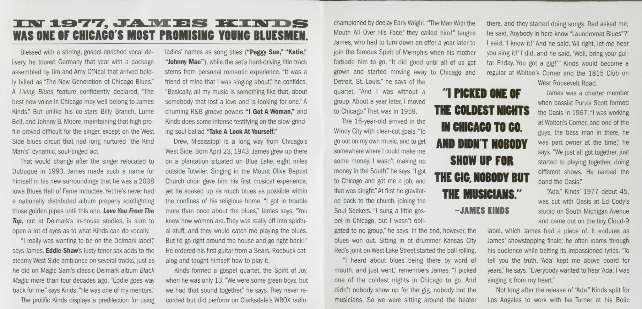 Blessed with a stirring, gospel-enriched vocal de-livery. he toured Germany that year with a package assembled by Jim and Amy O'Neal that arrived bold-ly billed as "The New Generation of Chicago Blues:' A Living Blues feature confidently declared, "The best new voice in Chicago may well belong to James Kinds: But unlike his co-stars Billy Branch, Lurrie Bell, and Johnny B. Moore, maintaining that high pro-file proved difficult for the singer, except on the West Side blues circuit that had long nurtured "the Kind Man's" dynamic, soul-tinged act. That would change after the singer relocated to Dubuque in 1993. James made such a name for himself in his new surroundings that he was a 2008 Iowa Blues Hall of Fame inductee.