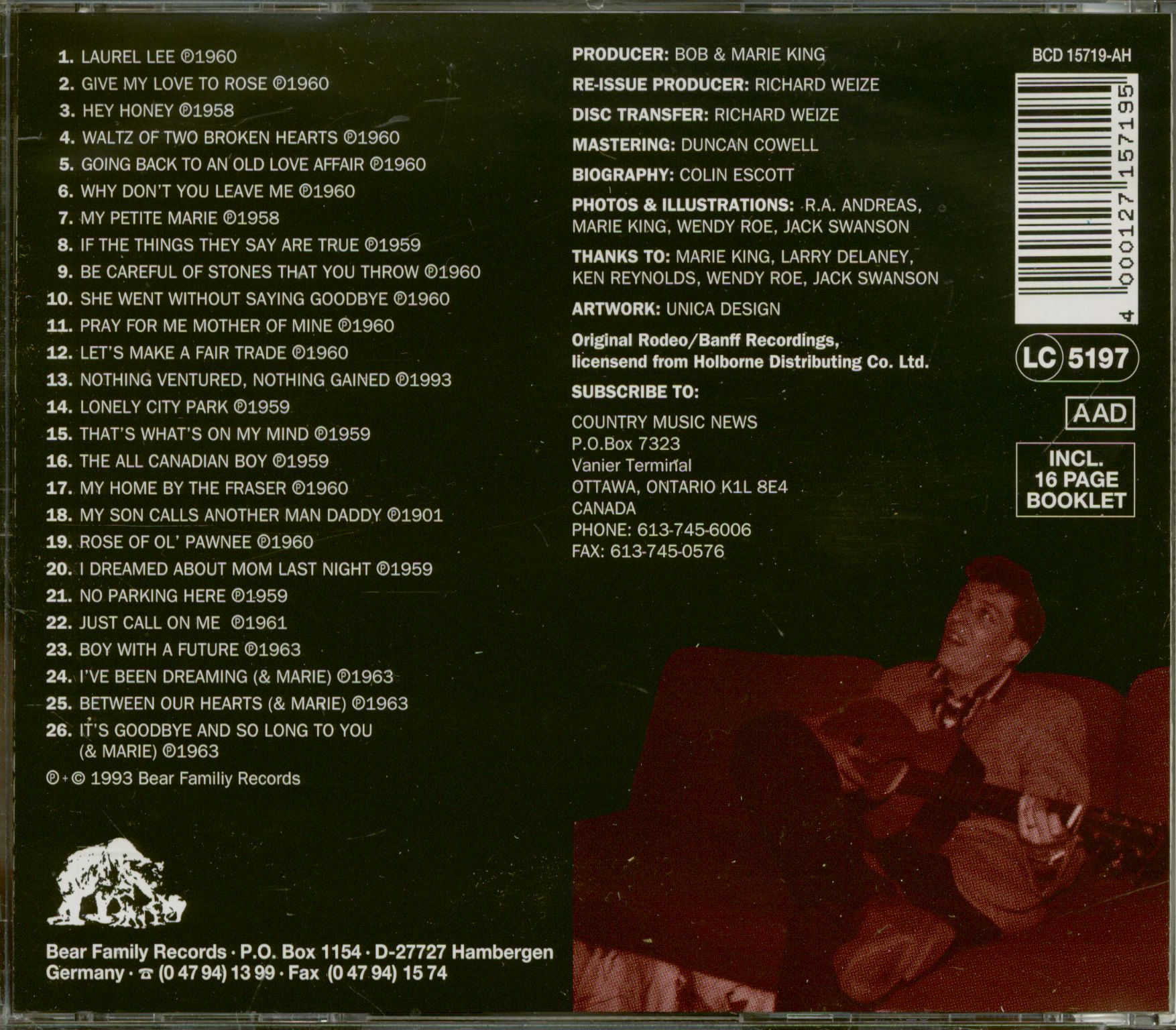 Lors de cette session, King a enregistré quatre de ses propres compositions. La chanson d'amour éthérée, Laurel Lee, reflétait le son traditionnel des ballades d'amour de cowboy à la Wilf Carter et des enregistrements antérieurs de Hank Snow. Il est rapidement devenu un succès régional, se vendant à plus de 40 000 exemplaires à Ottawa et dans les environs. Les trois autres chansons de la session reflétaient divers aspects du nouveau style honky tonk - le yodel bleu ludique de Daydreamer's Blues, la ballade déchirante, You're A Strange Little Girl, et le rythme sock hillbilly bop de Katie Brown.