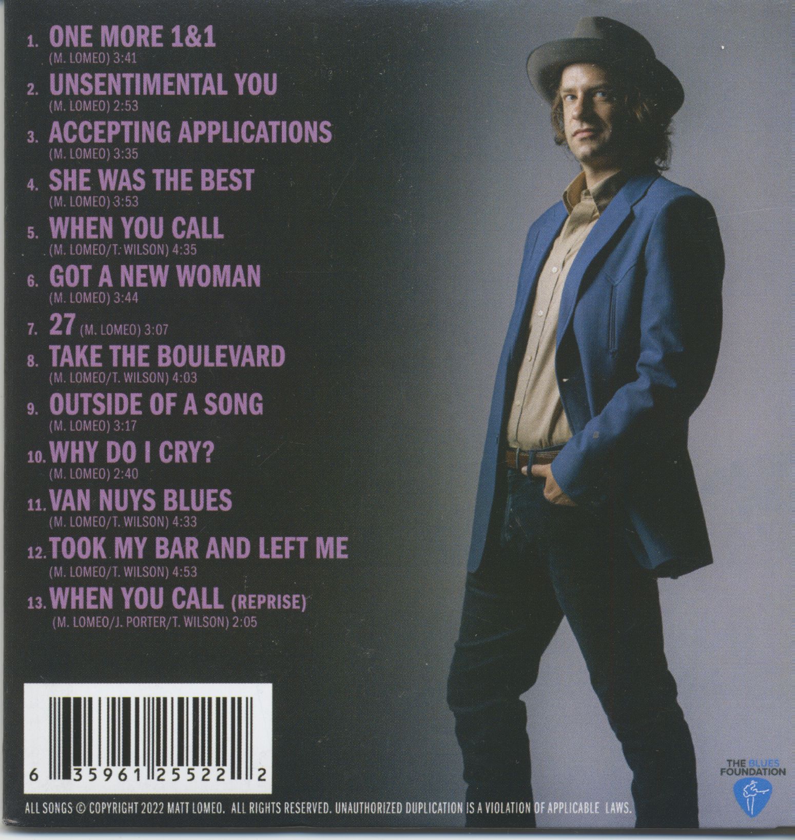 Un album très varié, sur lequel Matt Lomeo combine des morceaux soulful (One Moore 1&1, Accepting Applications), Tex Mex (Unsentimental You) avec de la musique roots (She Was The Best, When You Call, 27). Ce n'est qu'à partir du sixième titre "Got a New Woman" que l'on entend les premiers sons de blues. Tous les titres sont écrits par le groupe lui-même, parfois avec l'aide de Terry Wilson, qui contribue à l'album en tant que bassiste, guitariste et claviériste. Billy Watts nous livre le langoureux " Outside Of A Song " avec un magnifique travail de slide qui se marie à merveille avec le jeu de harpe acoustique de Matt Lomeo. Le rocker 'Why Do I Cry?', avec un excellent jeu de piano de Kevin Mckendree, est suivi de deux chansons de blues jazzy (Van Nuys Blues, Took My Bar And Left Me). Et enfin, une interprétation groovy de la chanson titre, 'When You Call', qui sonne complètement différente de la première version de cette chanson que nous avons rencontrée sur cet album. Une bonne première introduction à ce talentueux musicien et auteur-compositeur qui ne se limite pas à un seul style.