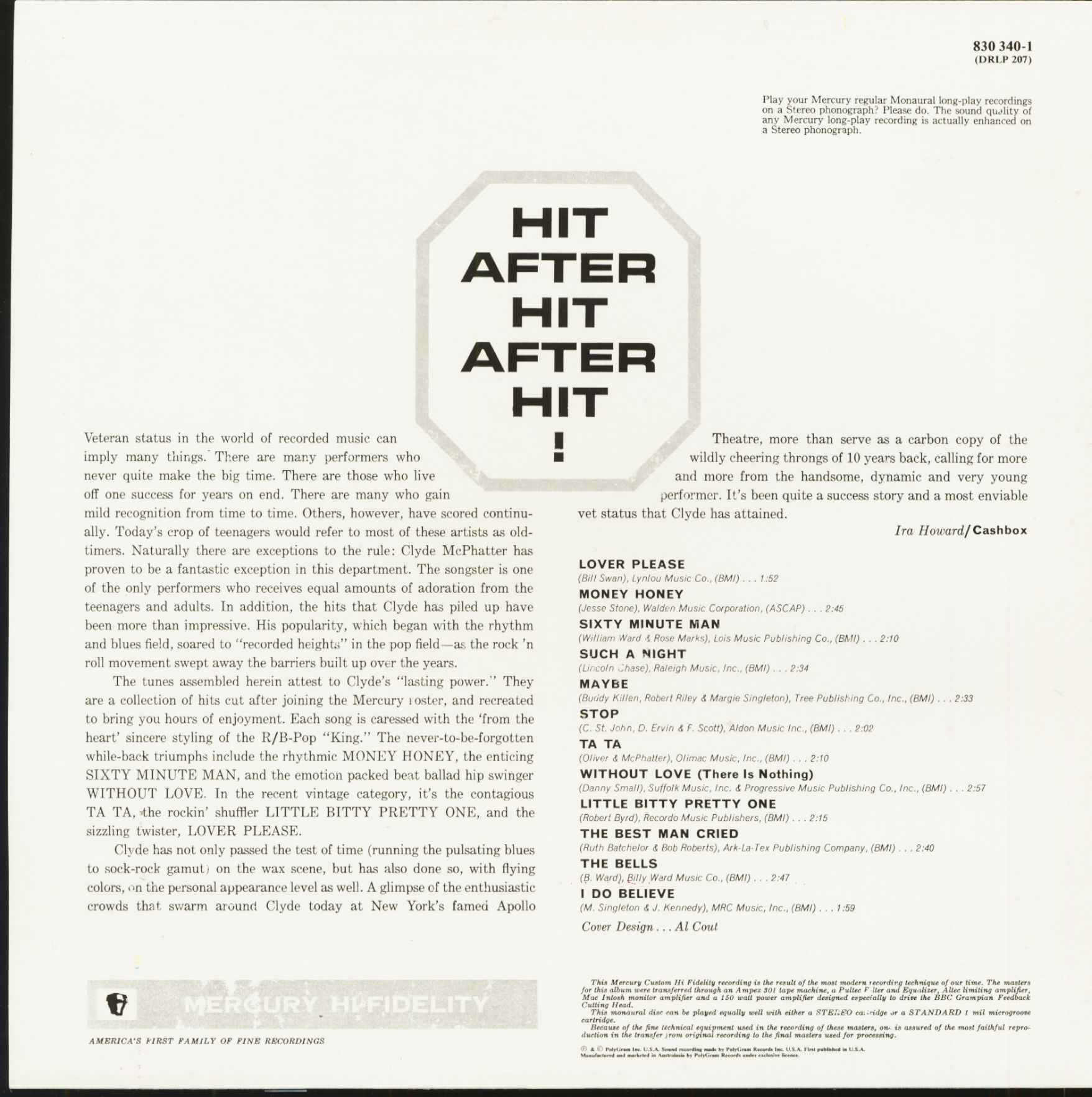 Naturally there are exceptions to the rule: Clyde McPhatter has proven to be a fantastic exception in this department. The songster is one of the only performers who receives equal amounts of adoration from the teenagers and adults. In addition, the hits that Clyde has piled up have been more than impressive. His popularity, which began with the rhythm and blues field, soared to 'recorded heights' in the pop field—as the rock 'n roll movement swept away the barriers built up over the years. The tunes assembled herein attest to Clyde's 'lasting power.' They are a collection of hits cut after joining the Mercury roster, and recreated to bring you hours of enjoyment.