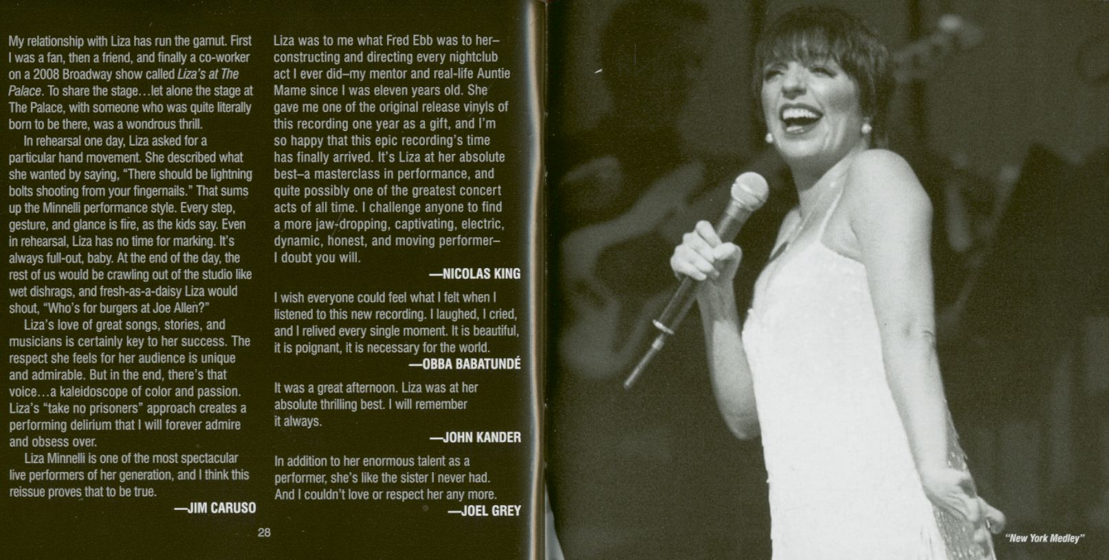 L'album Live at Carnegie Halldouble a capturé la soirée électrisante et entraînante de Liza du début à la fin, y compris des versions définitives de spectacles familiers comme Cabaret, But the World Goes 'Round et Theme From New York, New York de John Kander et Fred Ebb, ainsi que de nouvelles versions de standards contemporains, pop et classiques de Broadway par des sommités comme George et Ira Gershwin, Jule Styne et Stephen Sondheim, Barry Manilow et Melissa Manchester.