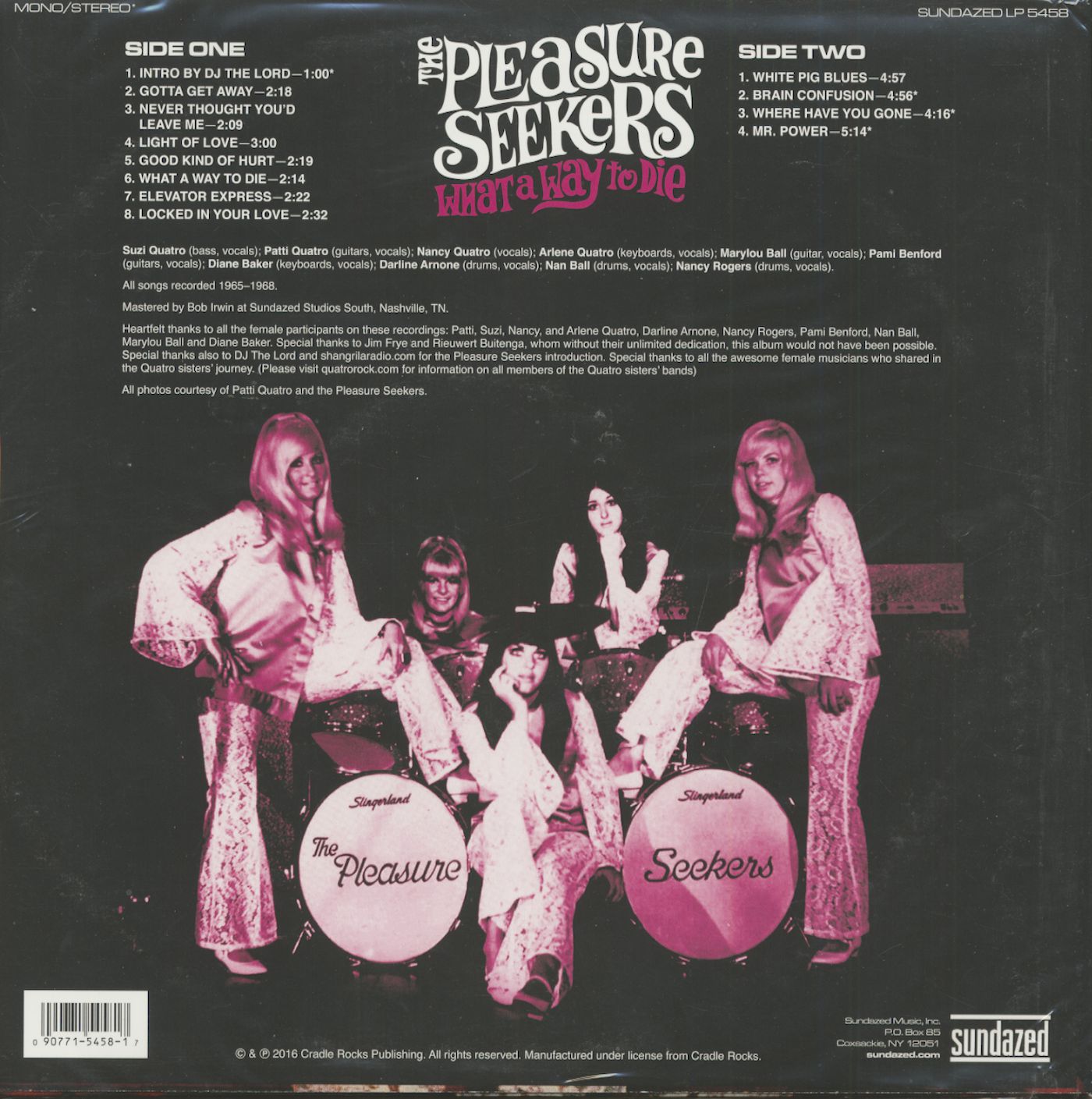 After a memorable 1968 Far East tour, playing for wounded returning American soldiers from Vietnam, the Pleasure Seekers (with new drummer Nancy Rogers) returned to a Detroit that was now, in Pattis words, exploding with heavier sounds. That sparked us to change direction with new ideas we had been exploring. Arlene left the band and we brought in our youngest sister Nancy (vocals). With Suzis Joplinesque vocals combined with Nancys wailing female Robert Plant style, we enjoyed a harder edged, double-punch effect.The last four songs on the album, 'White Pig Blues,' 'Brain Confusion,' 'Where Have You Gone?' and the atmospheric psychedelic mover 'Mr. Power,' all date from this 1968-69 period when the Pleasure Seekers were playing the Grande Ballroom alongside the MC5, Alice Cooper, the Stooges, the Amboy Dukes and SRC. With this change in musical direction and the departure of Arlene and Pami, the band forged on as Cradle. Suzi Quatro departed for England in 1971, launching a successful solo career. Patti and Nancy continued with Cradle until 1973 when Patti joined another pioneering female rock group, Fanny.