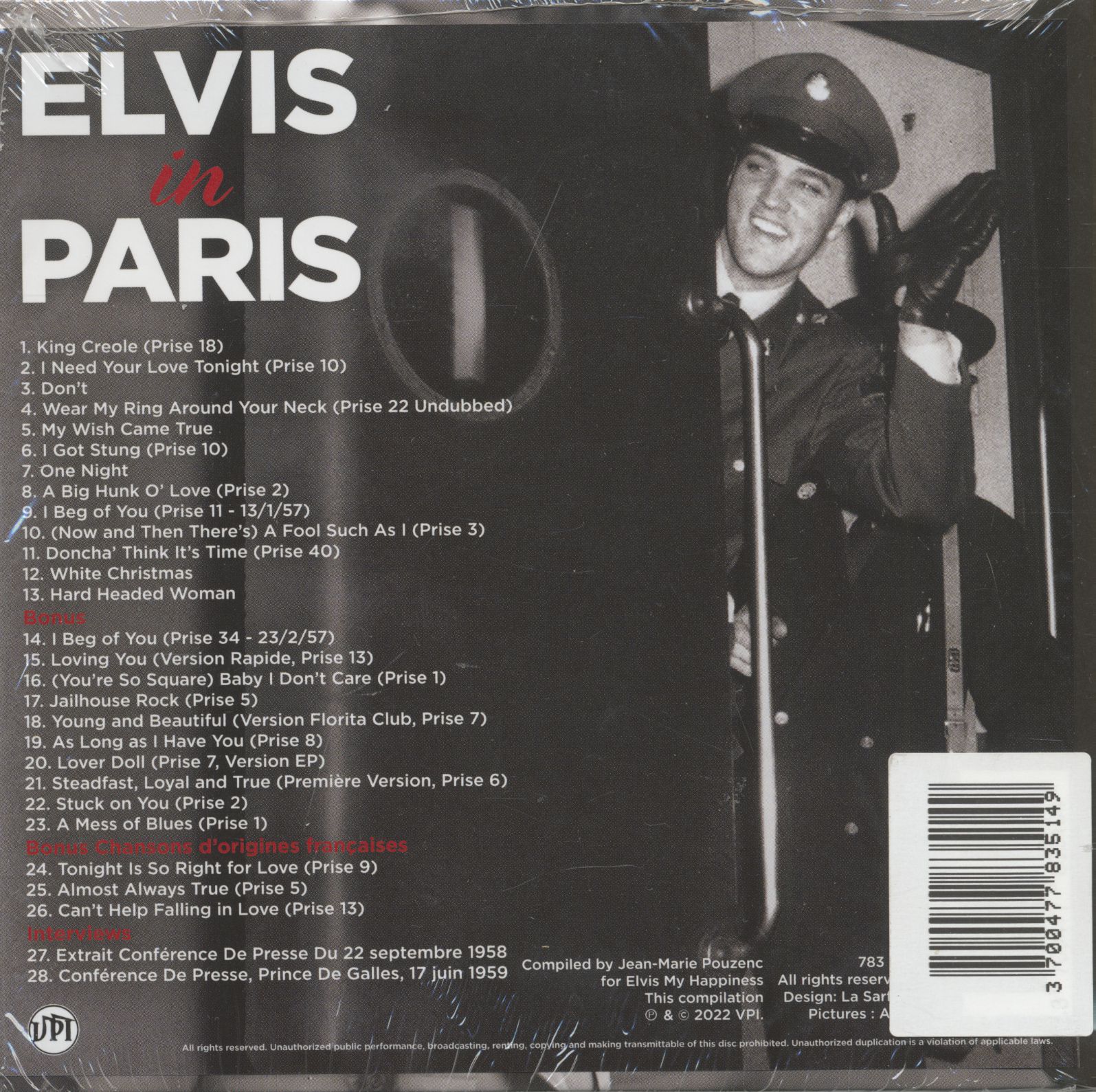 L'impact de ces chansons était si grand que presque toutes ont été éditées et publiées en français. Vous trouverez ici, le plus souvent sous forme de prises alternatives, les titres qui figuraient sur cet album vinyle, accompagnés en bonus de trois chansons d'origine française et d'extraits de conférences de presse d'Elvis ; et en prime, dix nouvelles prises alternatives de cette période. Les fans français n'ont jamais oublié que Paris a été la seule capitale européenne qu'Elvis a visitée.... et trois fois en plus !