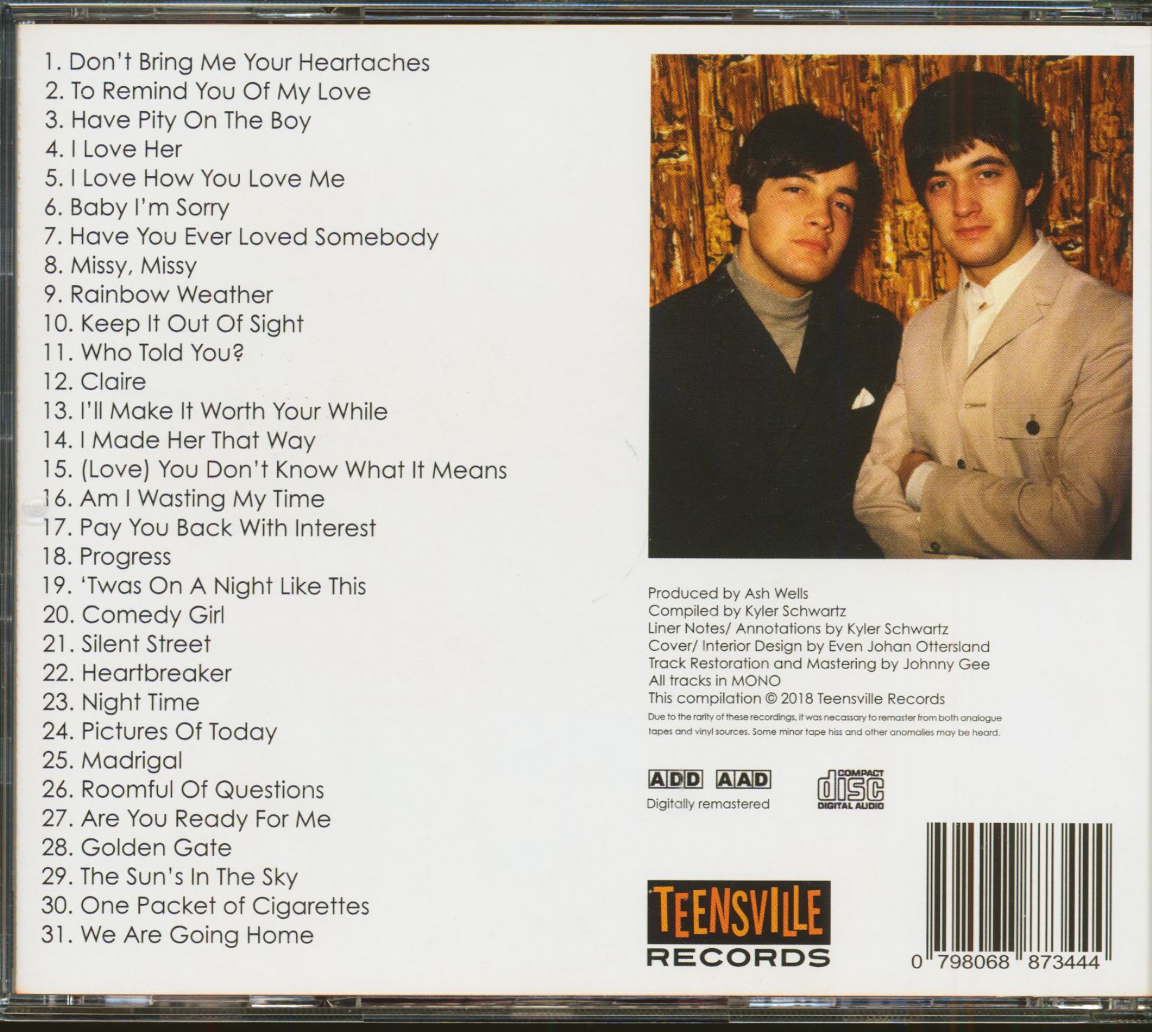 Les jumeaux Ryan sont passés brièvement au label MGM pour leurs deux derniers singles de la décennie (ensemble, c'est-à-dire). Le cabaret "Heartbreaker" et le psychopopop endormi de "Night Time" (écrit par Chris Curtis et Sharon Sheeley) ont été les premiers en octobre 67, suivis par le duo préféré du collectionneur de "Pictures Of Today" et "Madrigal" dans les premiers mois de 1968, qui a poursuivi l'expérimentation psychopopopopop. Malheureusement, les singles ne se vendaient pas, et dans un mouvement étrange, MGM a sorti un album éponyme en quantité tellement limitée que beaucoup de collectionneurs ne connaissent même pas son existence. Encore une fois, l'album ne comportait pas de singles. Il est uniformément excellent et présente une variété de styles, du freakbeat au music-hall.