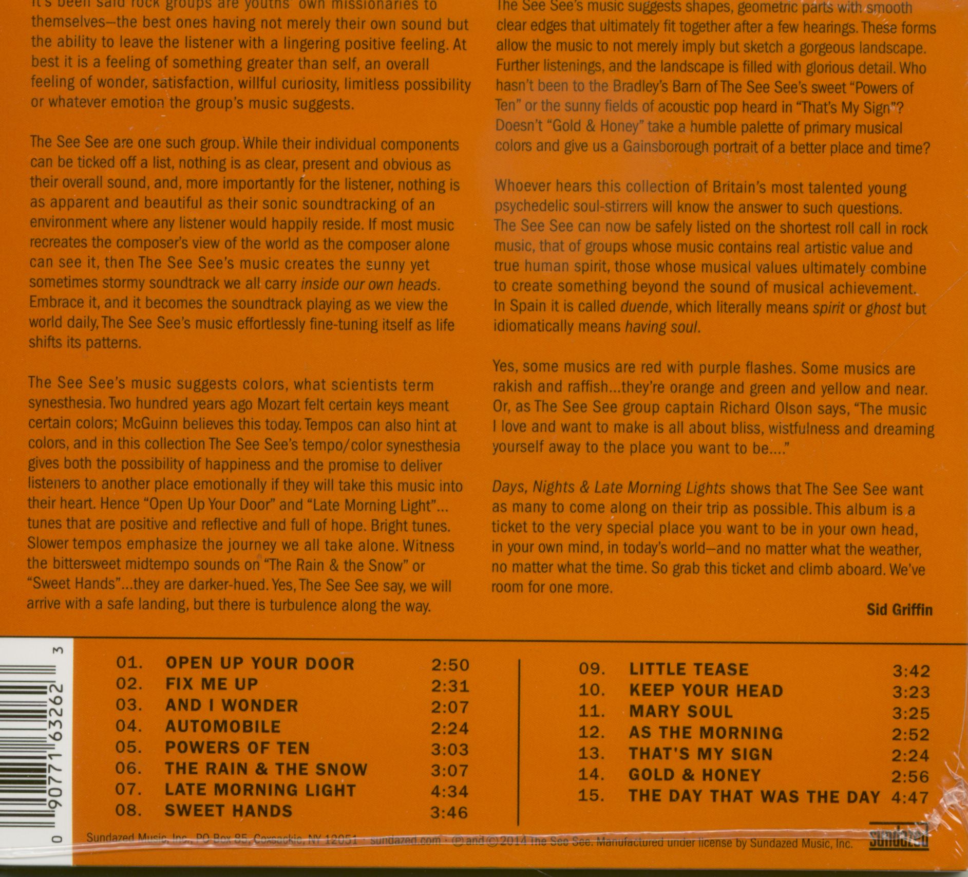 ,Days Nights & Late Morning Lights compile des extraits de singles et des deux précédents albums du groupe, mais le groupe se rapproche tellement de sa vision pop inspirée des années 60 que les chansons sonnent comme si elles avaient été coupées pendant une longue session. L'auteur-compositeur Richard Olson (à la fin du prometteur mais éphémère Eighteenth Day of May) semble écrire des tonnes de singles à volonté, comme le doux et brillant 'Open Up Your Door' et 'The Rain & The Rain &', la neige', le plus ouvertement 'Keep Your Head' et 'Late Morning Light' ou les folk-rocking 'Sweet Hands' et 'That's My Sign.” Le See See s'agite bien plus qu'il ne s'écrase, époussetant presque tout avec des harmonies vocales crémeuses. Ne vous attendez pas à l'innovation ici, mais ce n'est pas l'objectif du groupe. Au lieu de cela, le See See veut juste écrire de bonnes chansons et bien les jouer, et il le fait très bien, merci.