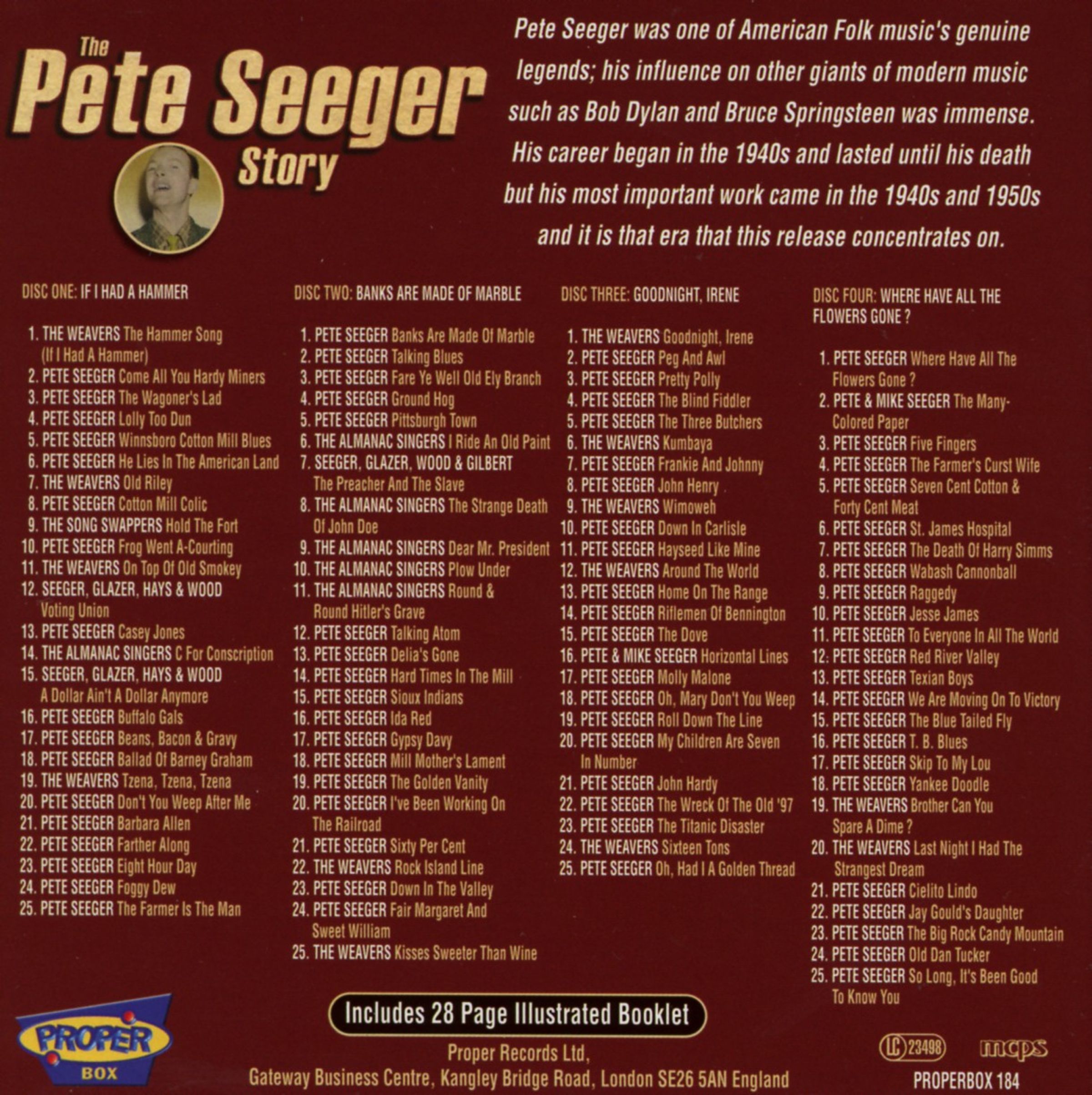 Sa carrière a débuté dans les années 1940 et s'est poursuivie jusqu'à sa mort, mais Seeger a écrit ses chansons les plus importantes dans les années 1940 et 1950. C'est cette époque que cette compilation explore, avec de nombreuses performances en solo, ainsi qu'avec The Almanac Singers et The Weavers. Les 100 titres de cette compilation de 4 CD célèbrent la vie de cette légende folk, et un livret de 28 pages raconte son histoire fascinante.