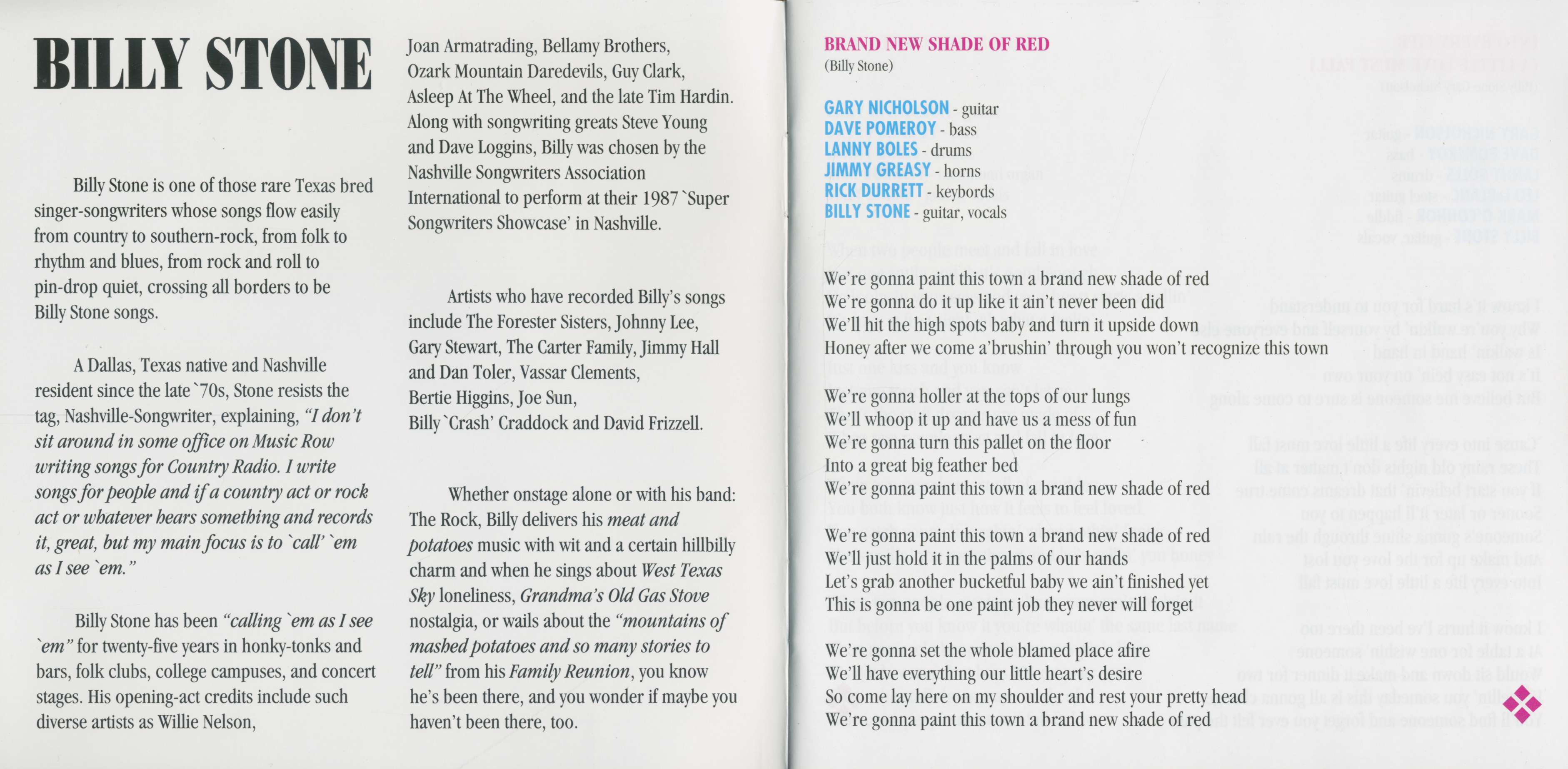 Billy Stone est l'un de ces rares auteurs-compositeurs-interprètes originaires du Texas dont les chansons passent facilement du country au rock sudiste, du folk au R&B, du rock 'n' roll au calme absolu. Mieux encore, ce sont toutes des chansons de Billy Stone. Originaire de Dallas, au Texas, et résident de Nashville depuis la fin des années 70, Billy Stone résiste à l'étiquette de Nashville-Songwriter. J'écris des chansons pour les gens et si un groupe de country, de rock ou autre entend quelque chose et l'enregistre, tant mieux, mais mon objectif principal est de les appeler comme je les vois". Parmi les artistes qui ont enregistré les chansons de Billy Stone, citons The Forester Sisters, Johnny Lee, Gary Stewart, The Carter Family, Jimmy Hall et Dan Toler, Vassar Cleveland et d'autres encore.