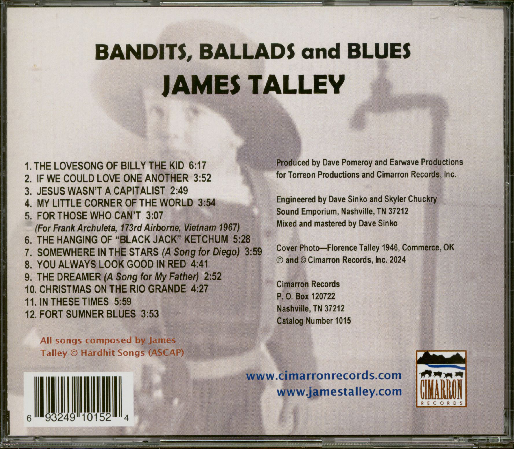 Bandits, Ballads and Blues, est le dernier chapitre de la remarquable carrière du légendaire auteur-compositeur-interprète James Talley, qui s'étend sur plus de 50 ans, depuis son album phare de Capitol Records, Got No Bread, No Milk, No Money, but We Sure Got a Lot of Love, enregistré en 1973. Son quinzième album contient douze nouvelles chansons puissantes couvrant un large éventail d'émotions humaines.