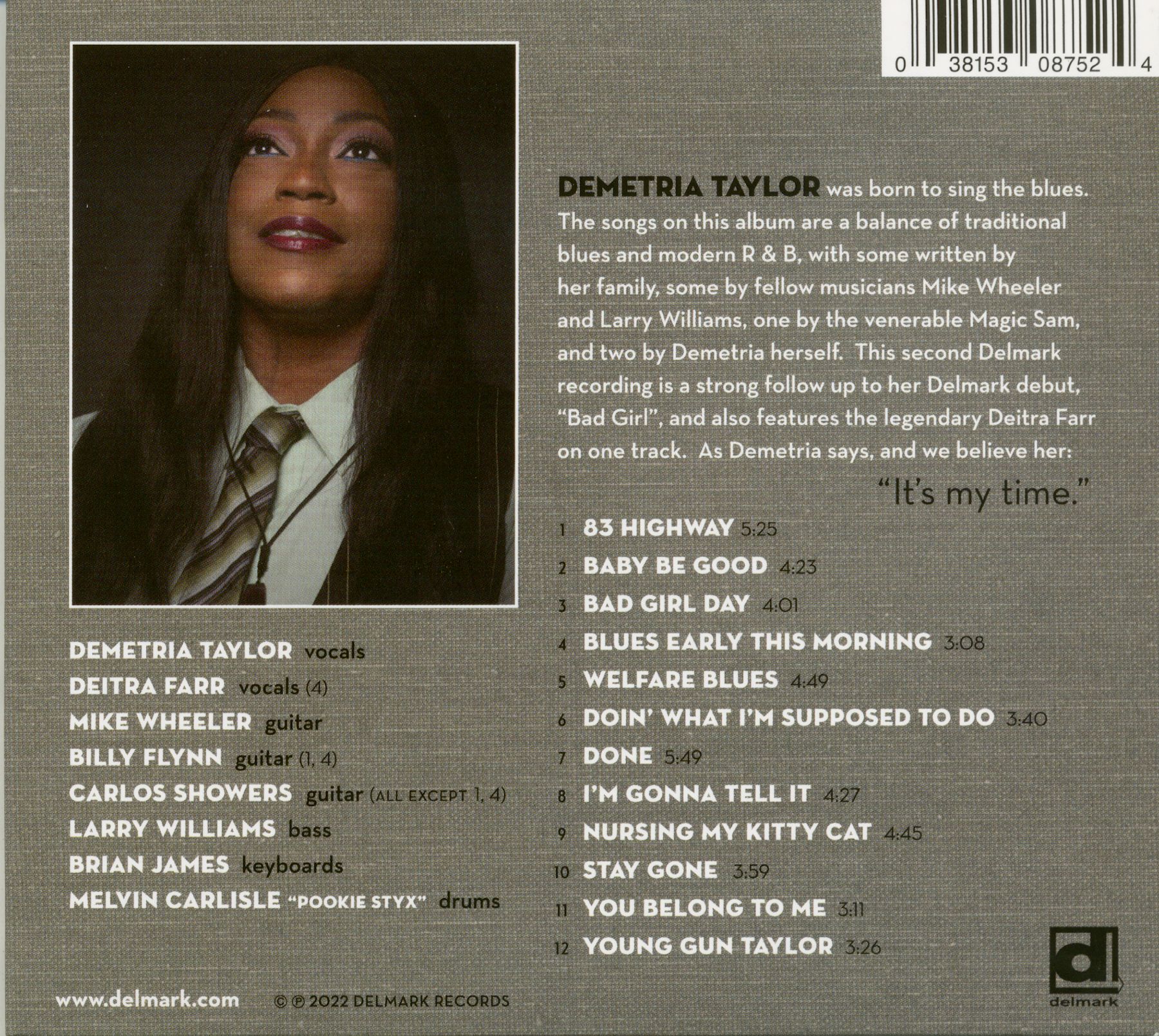 Demetria Taylor est née pour chanter le blues. Les chansons sur cet album sont un équilibre de blues traditionnel et de R & B moderne. R & B moderne, dont certaines ont été écrites par sa famille, d'autres par ses collègues musiciens Mike Wheeler et Larry Williams, une par le vénérable Magic Sam, et deux par Demetria elle-même. Sam, et deux par Demetria elle-même. Ce deuxième disque Delmark est une suite logique de son premier album Delmark, "Bad Girl". la légendaire Deitra Farr sur un titre. Comme Demetria dit, et nous la croyons