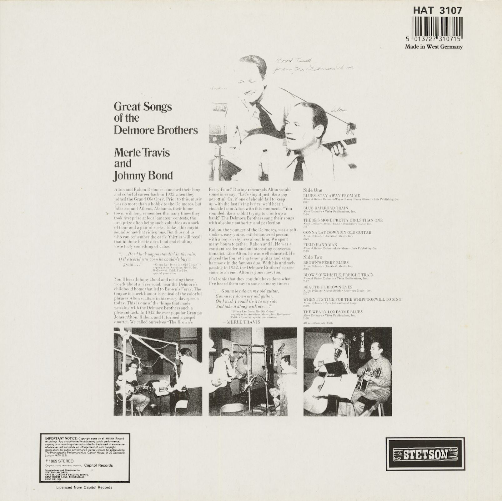 (Stetson) 12 titres, réédition rare de l'album original Capitol de 1969. Merle et Johnny ont repris les meilleures chansons des Delmore Brothers sur ce disque !
