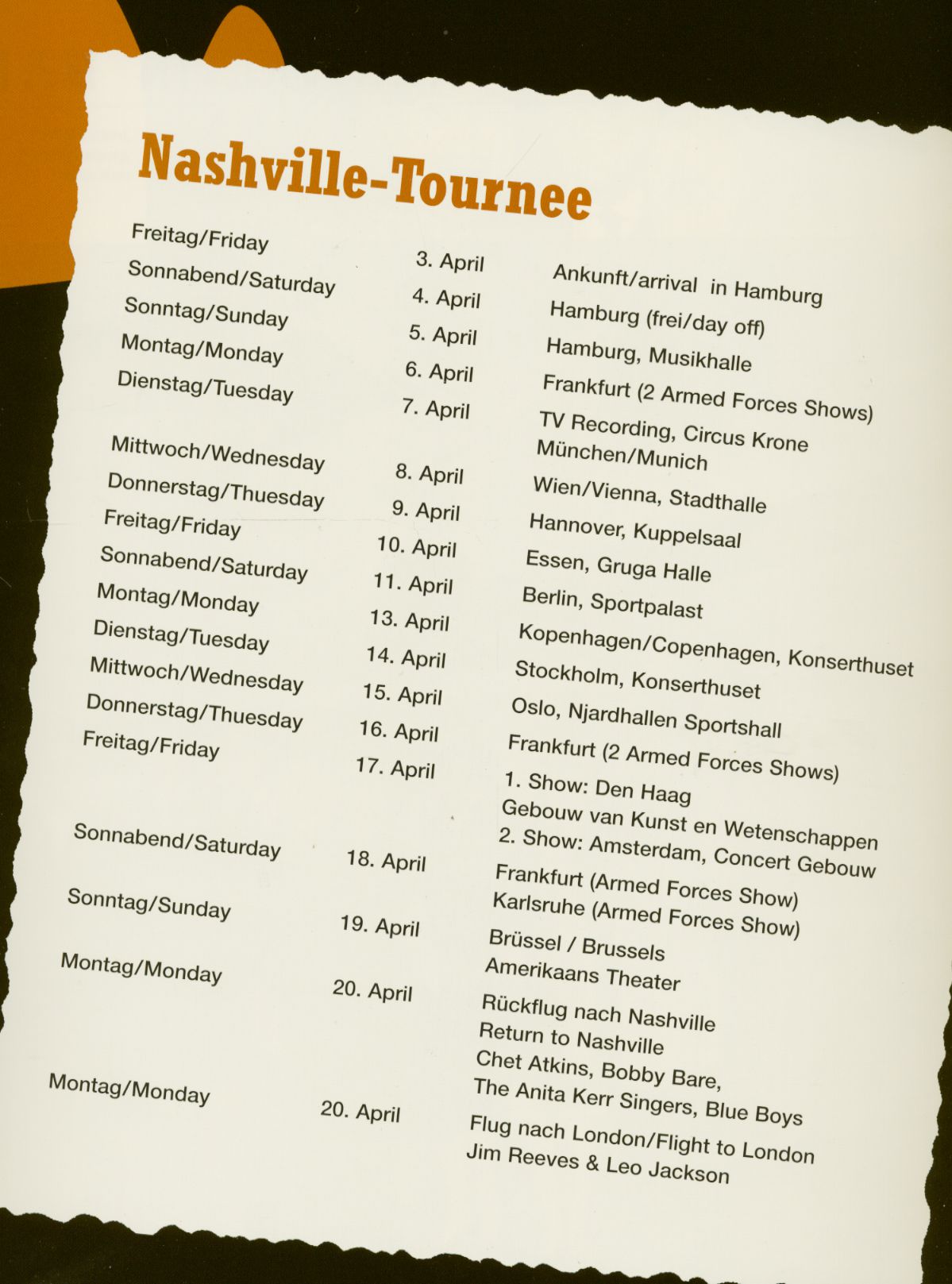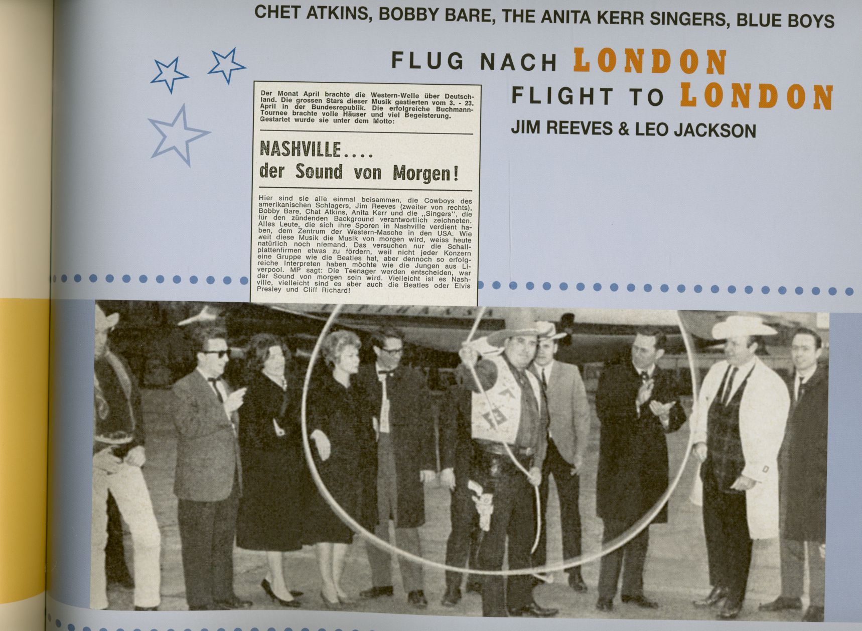 Im April 1964 schickte die US-Plattenfirma RCA einige Country-Künstler auf Promotion-Tour durch Europa. Start war am 2. April vom New Yorker John F. Kennedy International Airport. Am Freitag, dem 3. April schwebte die Lufthansa Boing 727-200 mit der Truppe bei regnerischem Wetter in Hamburg ein. Ihnen blieb der Samstag zum Akklimatisieren, am Sonntag dann folgte der erste Auftritt in der Hamburger Musikhalle. Bis zum 20. April war das Programm voll, lediglich am 12. April hatten sie einen freien Tag in Berlin. Das übrige Programm: drei mal Frankfurt, je ein Tag in München, Wien, Hannover, Essen, Kopenhagen, Stockholm, Oslo, Den Haag, Amsterdam, Karlsruhe, Brüssel und schließlich der Rückflug nach Nashville.