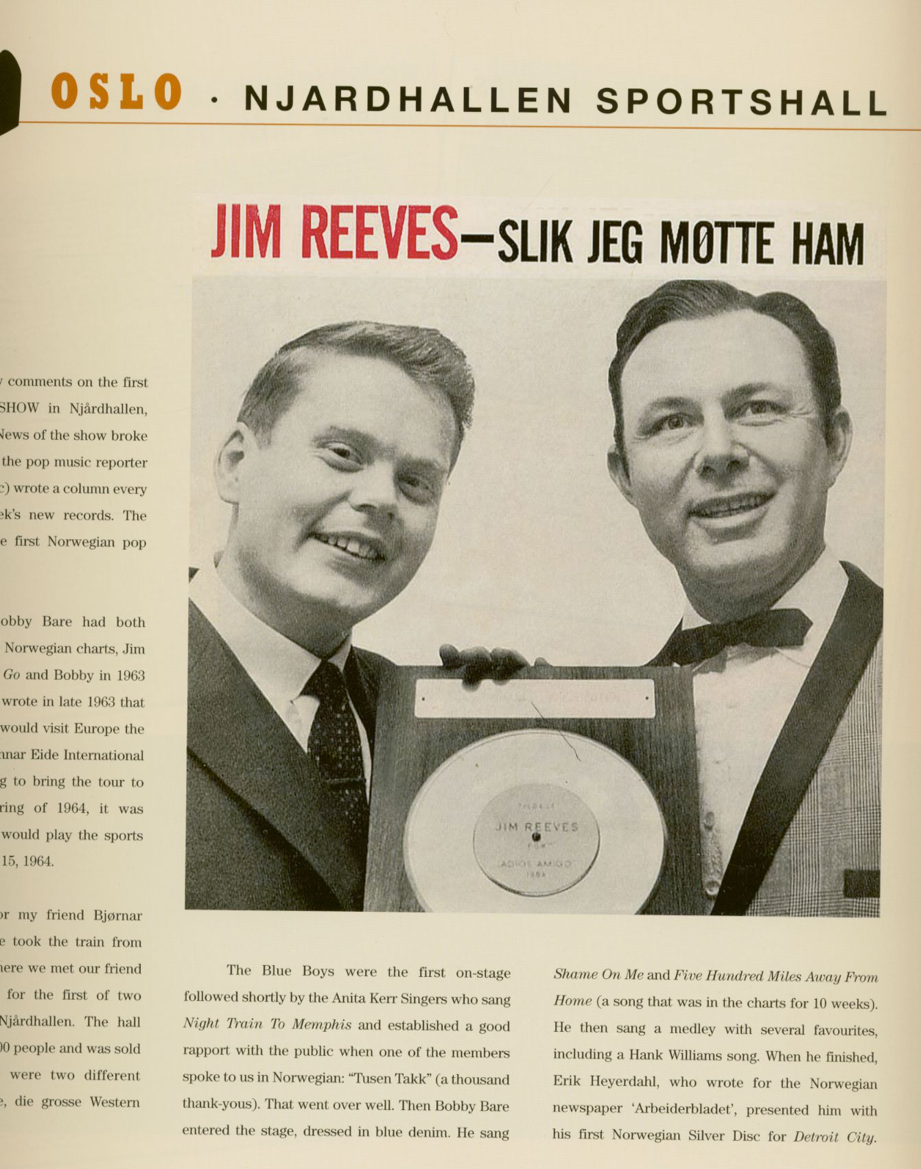 Während ich die ersten drei CDs gehört habe, stellte ich mir immer wieder vor, wie schön es wäre, wenn es von diesen Aufnahmen auch einen Film gäbe. Als ich dann die fünfte CD mit dem Mitschnitt des Konzertes vom 15. April in Oslo einlegte, machte mein CD-Player schlapp und sagte mir unmissverständlich es sei keine CD eingelegt. Kein Wunder, denn dabei handelt es sich um eine DVD. Sie enthält zunächst einige kurze gefilmte Eindrücke von der Ankunft der RCA-Tournee in Amsterdam. Sodann singt Jim Reeves in der Flughafen-Lounge „I Love You Because", nur von seiner Gitarre begleitet. Anschließend dann live und in schwarz/weiß 22 Titel, vom „Steel Guitar Rag" der Blue Boys über drei Titel der Anita Kerr Singers zu vier Songs mit Bobby Bare, ehe dann Meister Chet Atkins in die Saiten greift. Einige Stücke spielt er zusammen mit der Band, andere trägt er allein vor. Bei den letzten beiden Titeln „Peanut Vendor" und „Tiger Rag" wird er wieder von den Blue Boys unterstützt. Fünf Titel mit Jim Reeves beenden das Programm, zum Abschluss singt er dann passenderweise "Adios Amigos".