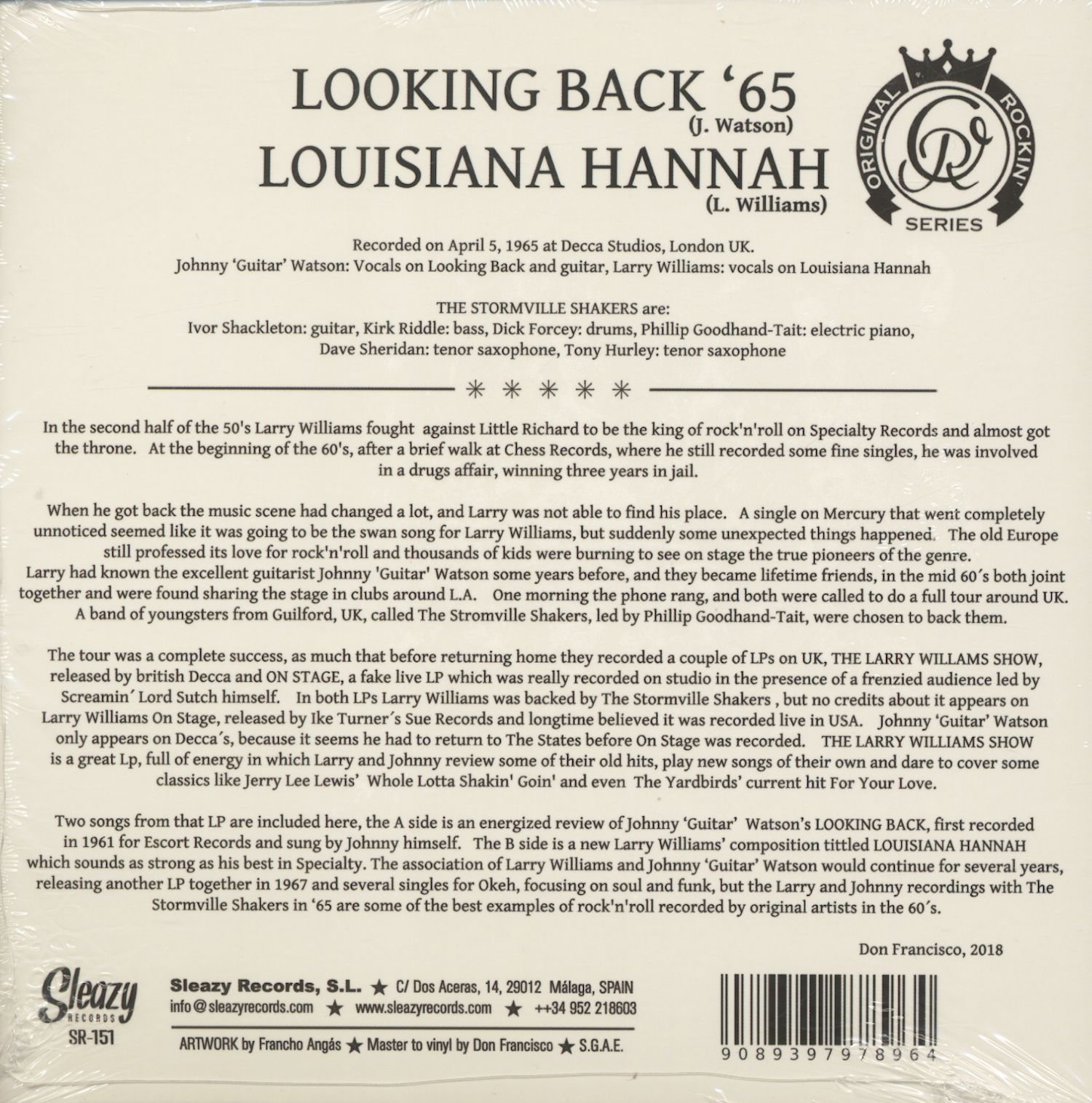 Deux chansons de cet album sont incluses ici, la face A est une critique énergique de'Looking Back' de Johnny'Guitar' Watson, enregistré pour la première fois en 1961 pour Escort Records et chanté par Johnny lui-même. La face B est une nouvelle composition de Larry Williams intitulée'Louisiana Hannah' qui sonne aussi fort que son meilleur en spécialité. L'association de Larry Williams et Johnny'Guitar' Watson se poursuivra pendant plusieurs années, avec la sortie d'un nouvel album en 1967 et de plusieurs singles pour Okeh, axés sur la soul et le funk, mais les enregistrements de Larry et Johnny avec The Stormville Shakers en 1965 sont quelques-uns des meilleurs exemples du rock'n'roll enregistré par les artistes originaux dans les années 60.