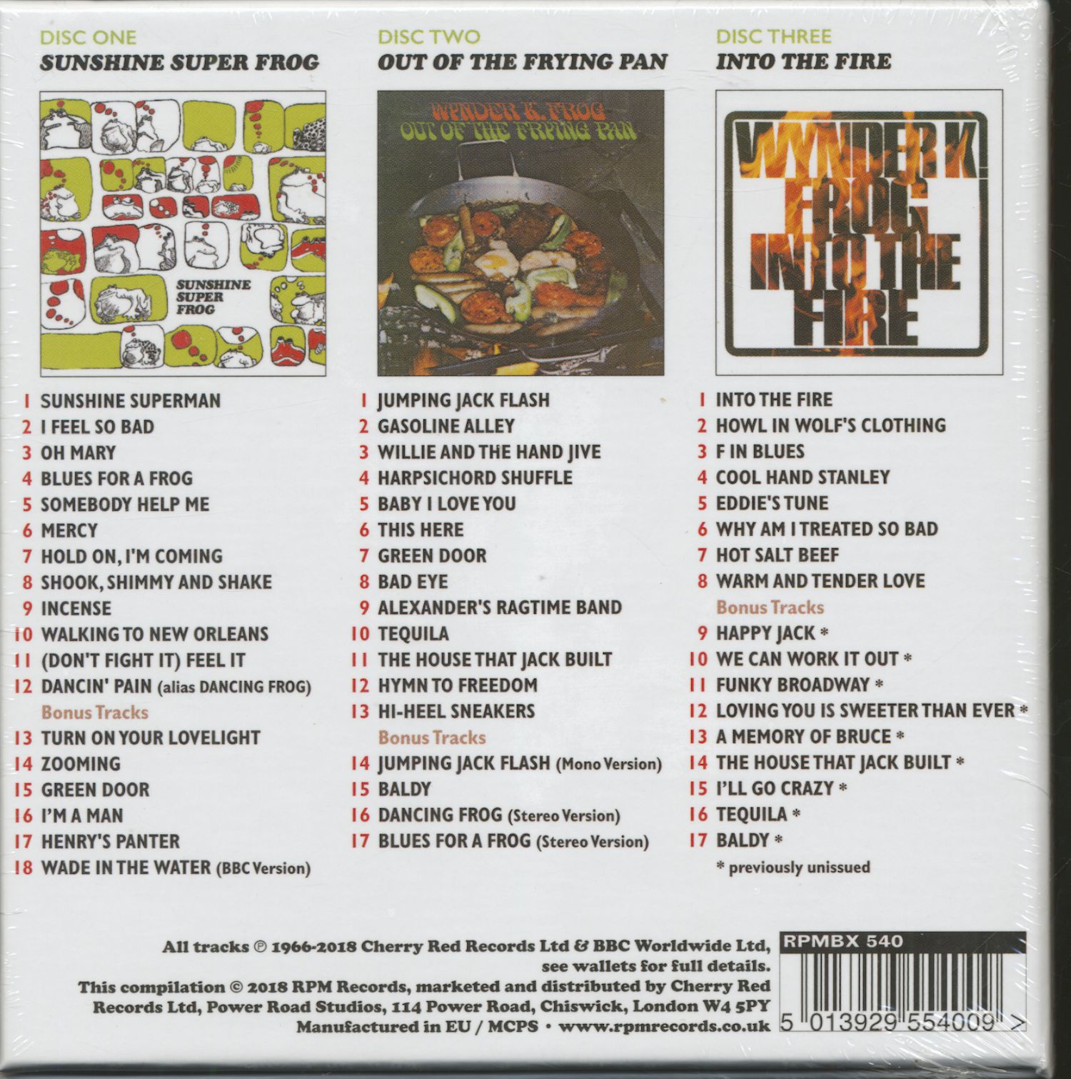 Essentiellement un véhicule pour le maestro de l'orgue Hammond Mick Weaver, groupe britannique de la fin des années 60'Wynder K. Frog' spécialisé dans le club funky Soul/Jazz. Originaire de Bolton, Lancashire, mais basé à Londres pendant une grande partie de leur carrière, Mick et le groupe ont fait trois albums pour Island Records entre 1966 et 1970. Ceux-ci ont longtemps été convoités par les collectionneurs de Mod et les fans du prestigieux label Island.Pour la première fois, les trois disques - Sunshine Super Frog (mono, 1966), Out Of The Frying Pan (stéréo, 1968) et Into The Fire (stéréo, 1970) - apparaissent sur un seul paquet, accompagné d'une foule de titres rares non album, du matériel inédit, une piste d'une session radio de la BBC et deux mixages stéréo de la bande-son au film The Touchables de 1968.